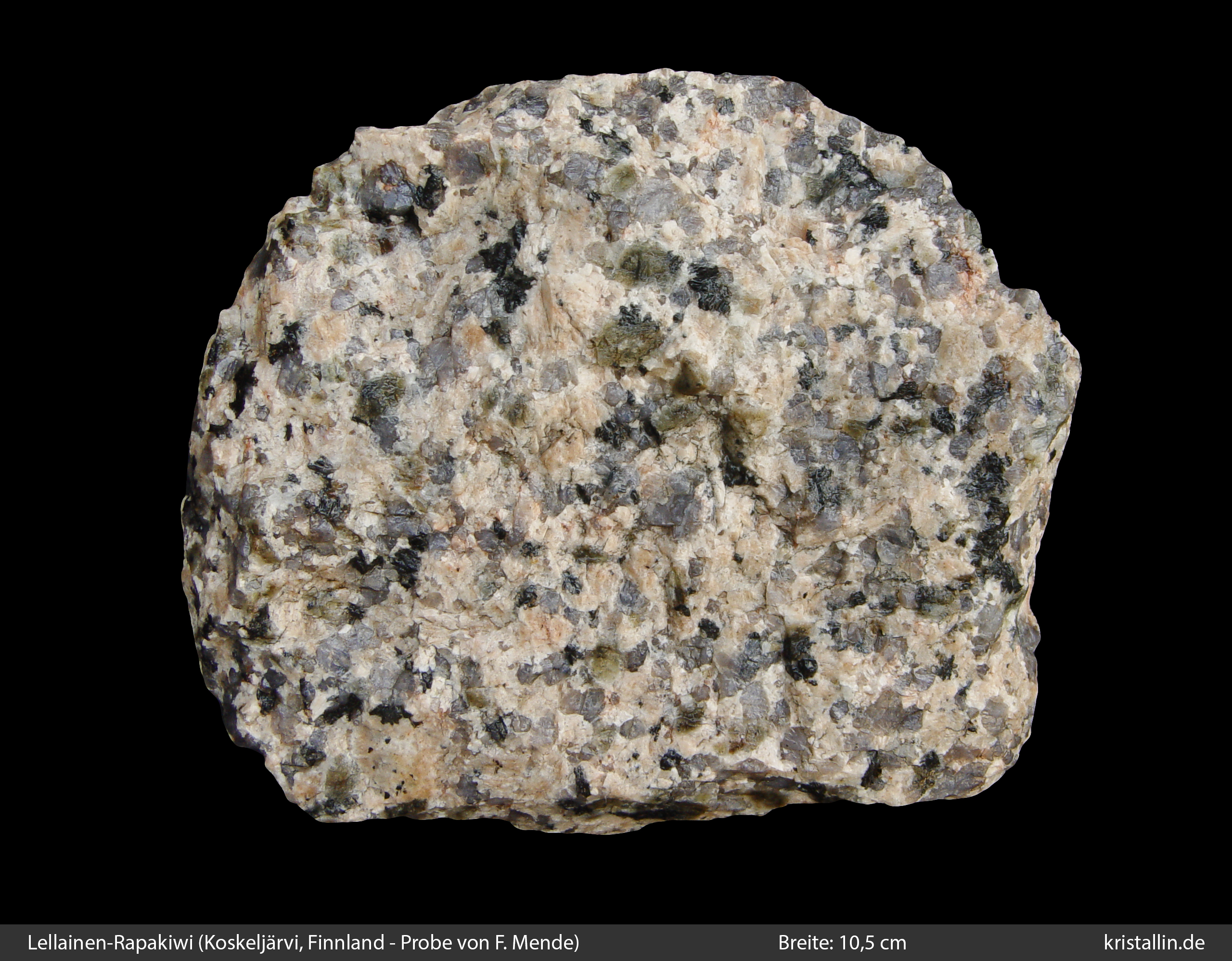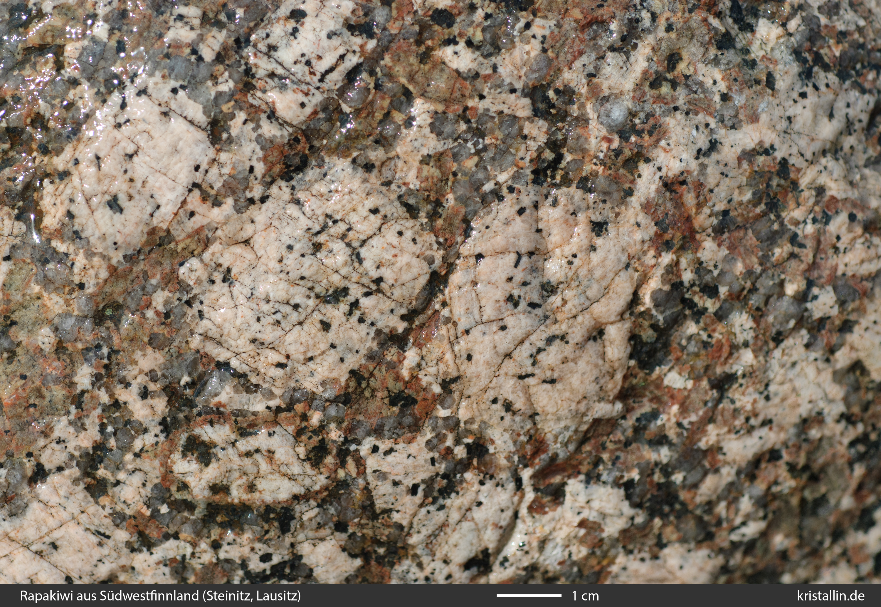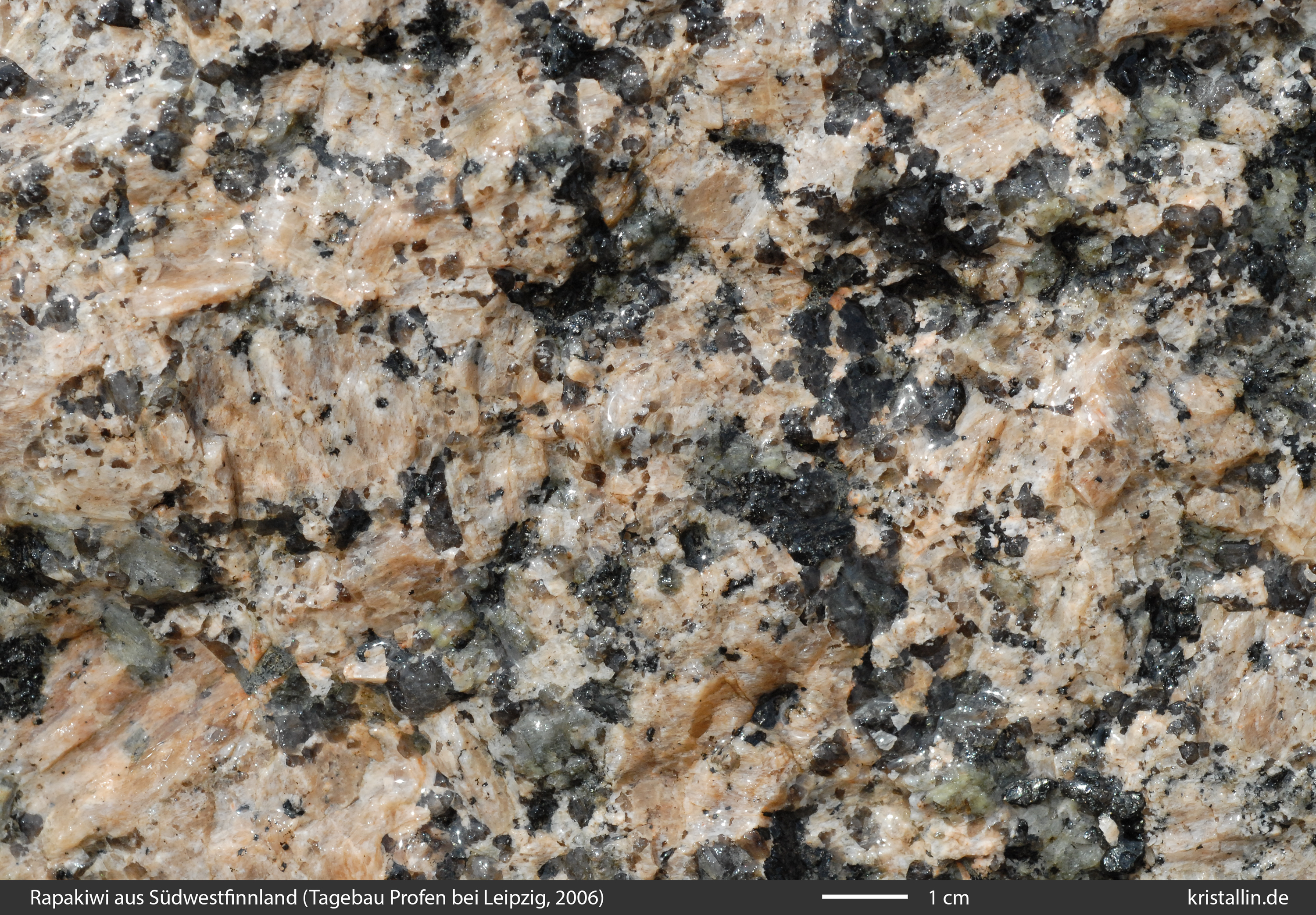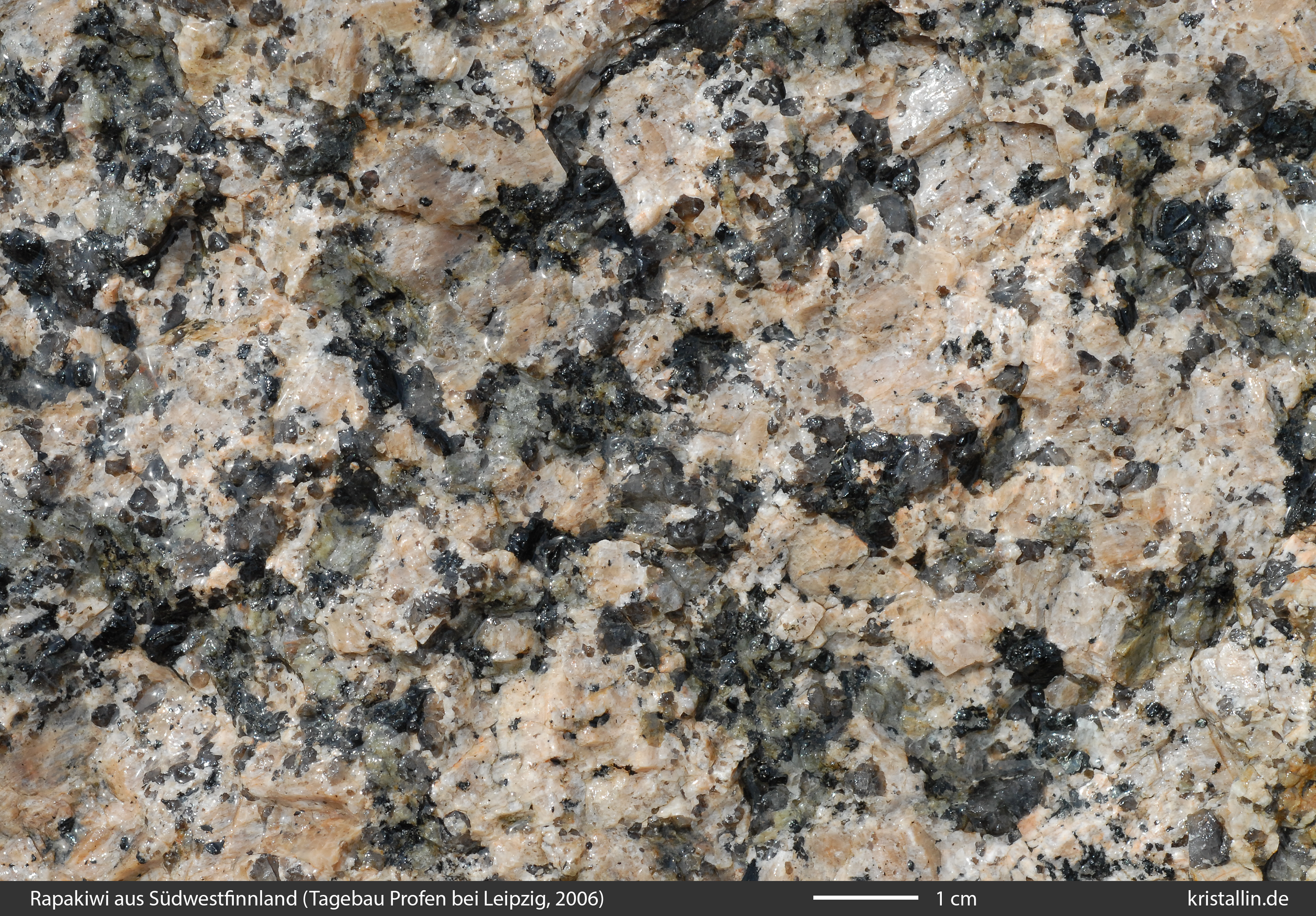 Der Rapakiwi von Peipohja ist grobkörnig und besitzt zum Teil ein Gefüge, das einem Pyterlit nahekommt. Die Probe 534 ist dafür ein Beispiel. Allerdings sind die wenigen rundlichen Feldspäte, die ich im Gelände fand, wohl zu selten, um die Bezeichnung „Pyterlit“ zu rechtfertigen, denn in den finnischen Karten wird Peipohja als porphyrischer Rapakiwi geführt. Wegen der schwierigen Aufschlussverhältnisse dort kann ich nur zwei Proben zeigen.