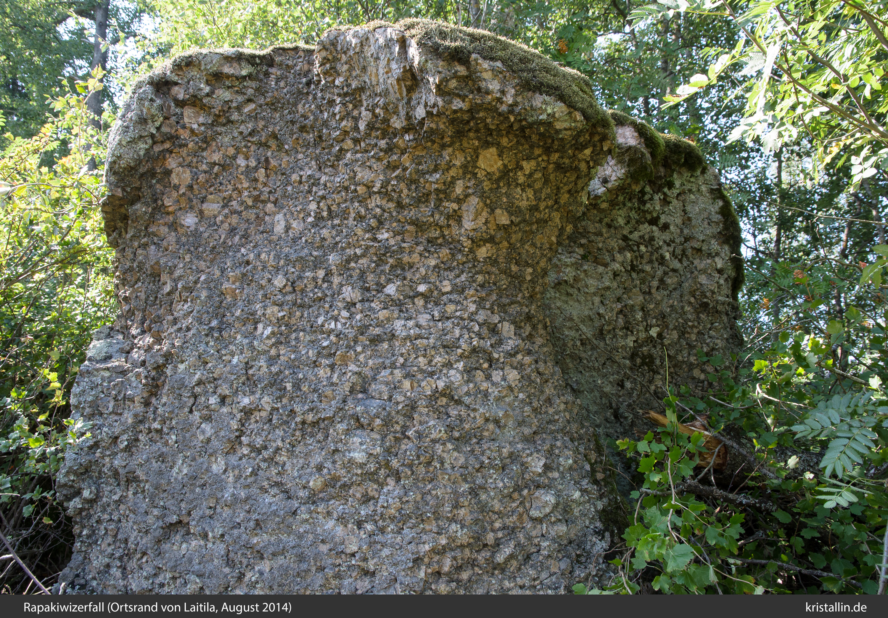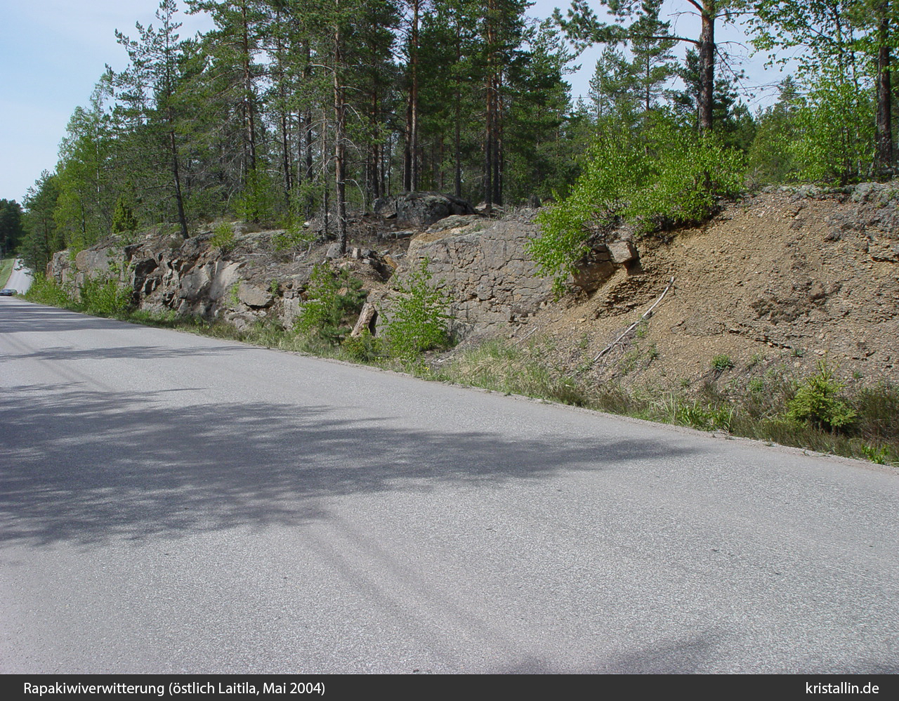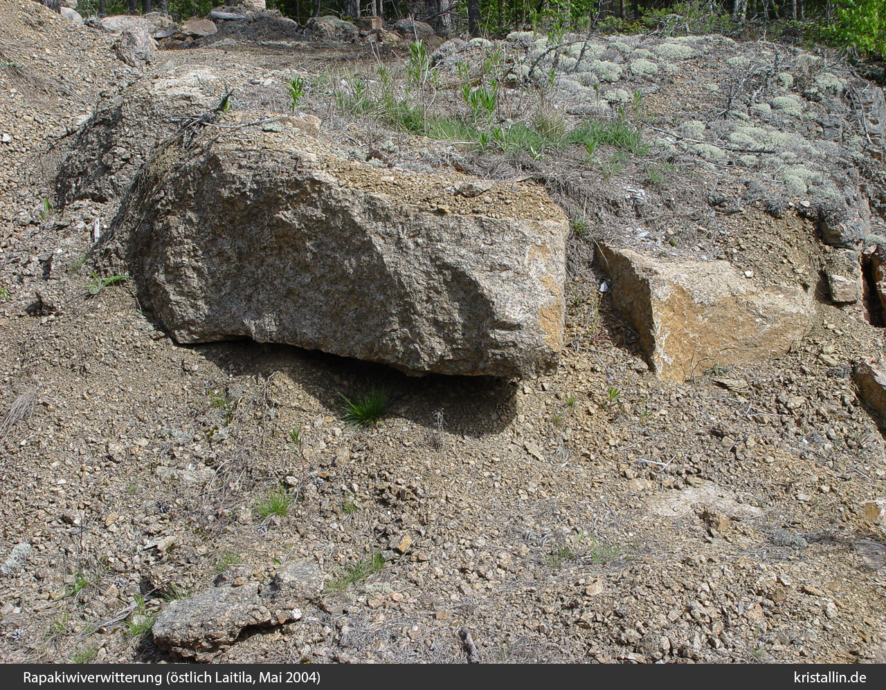 Die Zersetzung der Rapakiwis findet man im Laitila-Gebiet an mehreren Stellen und nach meinem Eindruck etwas häufiger als im Wiborgpluton. Das folgende Beispiel wurde an der Straße Laitila - Kaivola fotografiert.