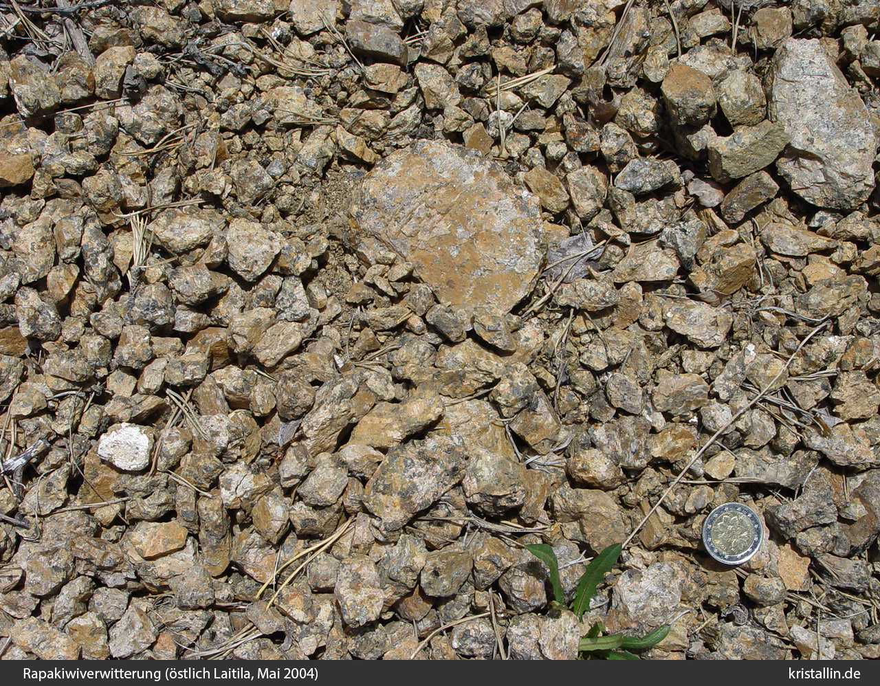 Die drei Nahgeschiebe der Bilder 3-5 wurden in einer Kiesgrube im Laitilagebiet sorgfältig ausgewählt. Sie sind die kleinstmöglichen Stücke, die noch alle Merkmale des Leitgeschiebes zeigen. Solche beigefarbenen Pyterlite gibt es auf großer Fläche nur im Laitila-Vehmaa-Pluton und in keinem anderen Vorkommen Skandinaviens. Als Geschiebe kann man sie sicher erkennen, ohne auf Begleitgesteine achten zu müssen. Sie sind ausgezeichnete Leitgeschiebe.