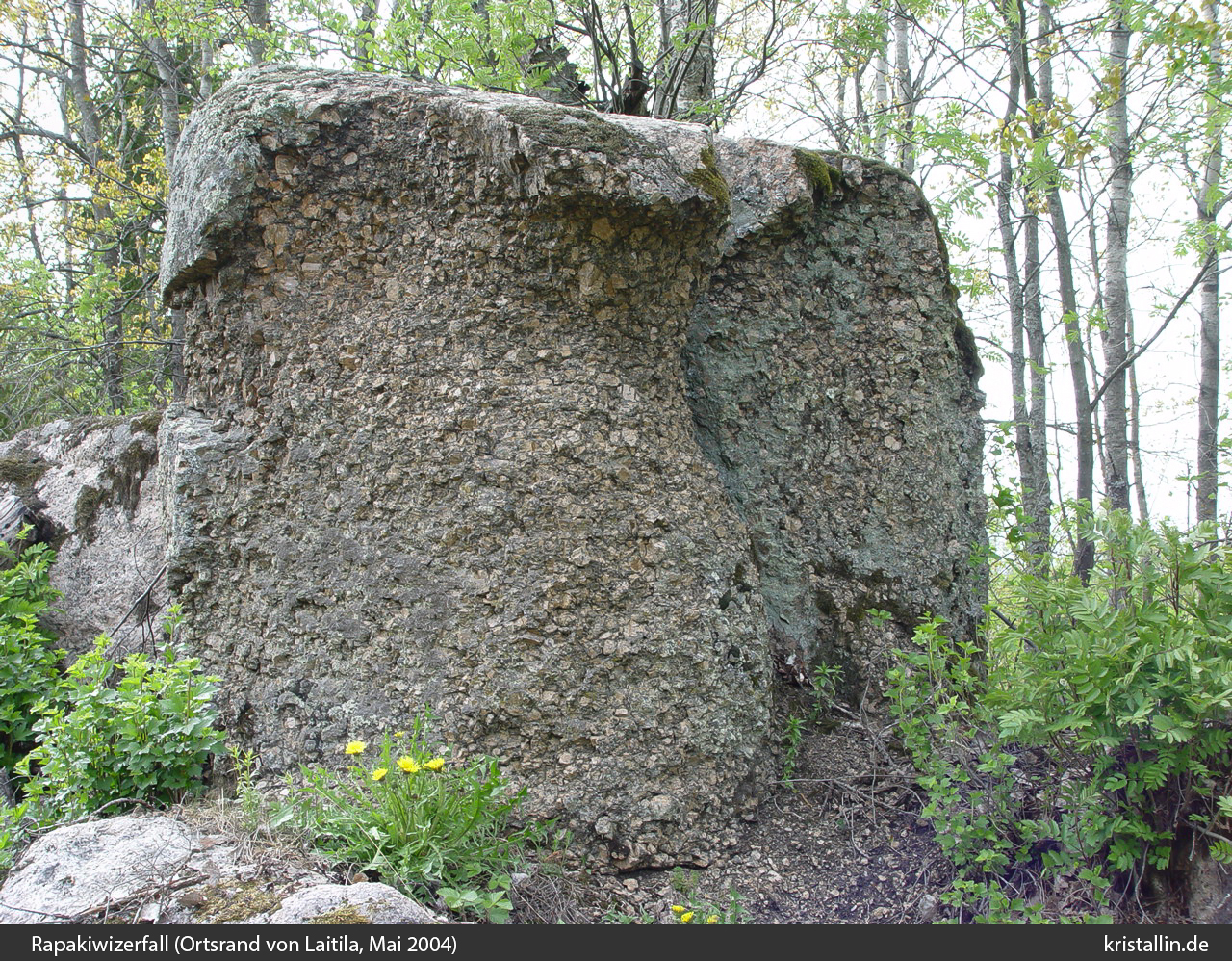 Bei meinem ersten Besuch im Jahr 2004 fiel mir ein Findling am Stadtrand von Laitila auf, der sich im Zerfall befindet. 10 Jahre später sind die Bäume größer und der Stein ist etwas kleiner.