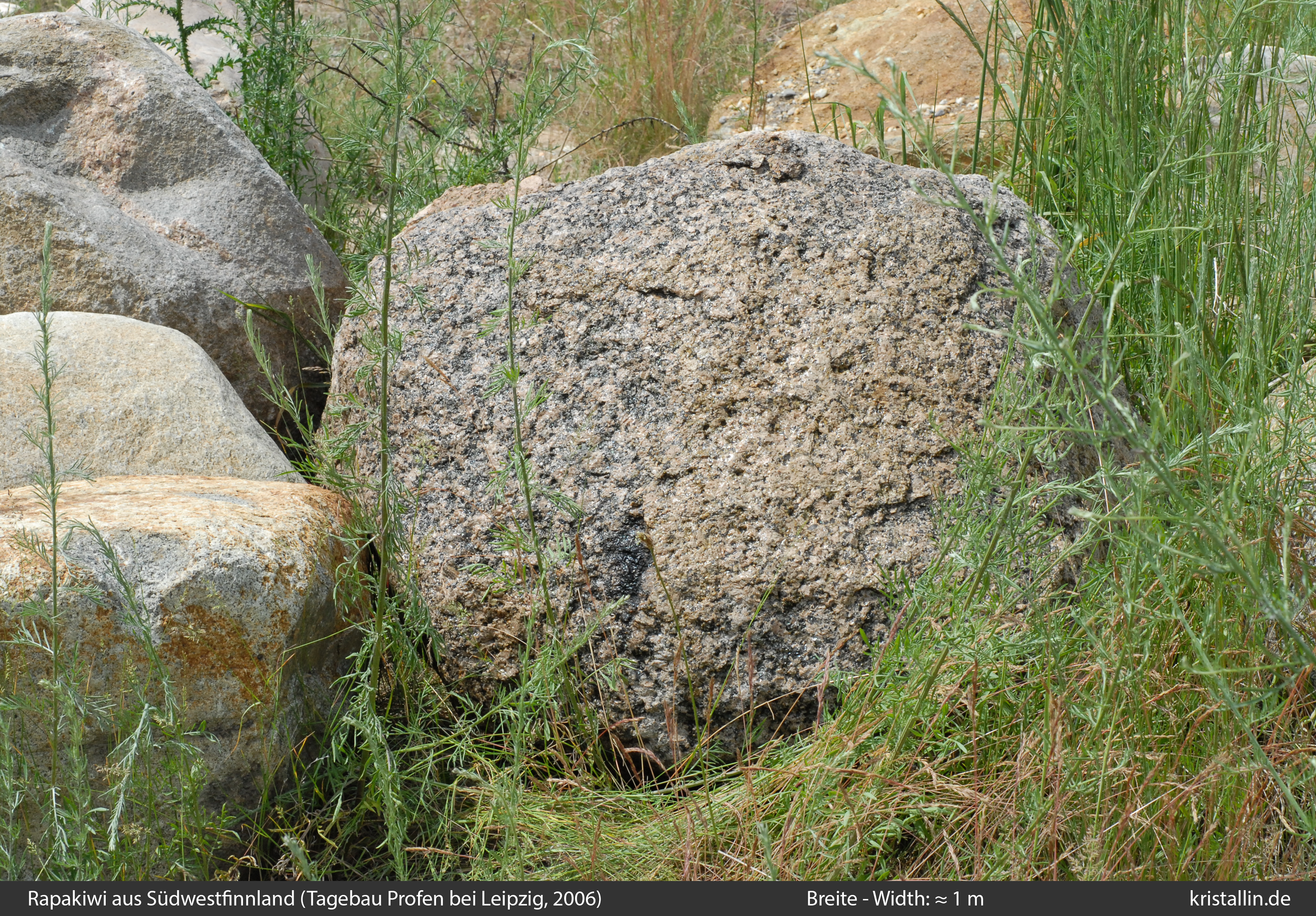 Neben viel Pyterlit gibt es in beiden Plutonen auch porphyrische und gleichkörnige Rapakiwis. „Porphyrisch“ heißt, dass die Ovoide fehlen und die Feldspäte tendenziell kantig sind. Porphyrische Rapakiwis sind nur in Ausnahmefällen als Leitgeschiebe geeignet, denn ganz ähnliche Gefüge gibt es im Kökarsfjärden-Pluton und in anderen Granitmassiven Skandinaviens.