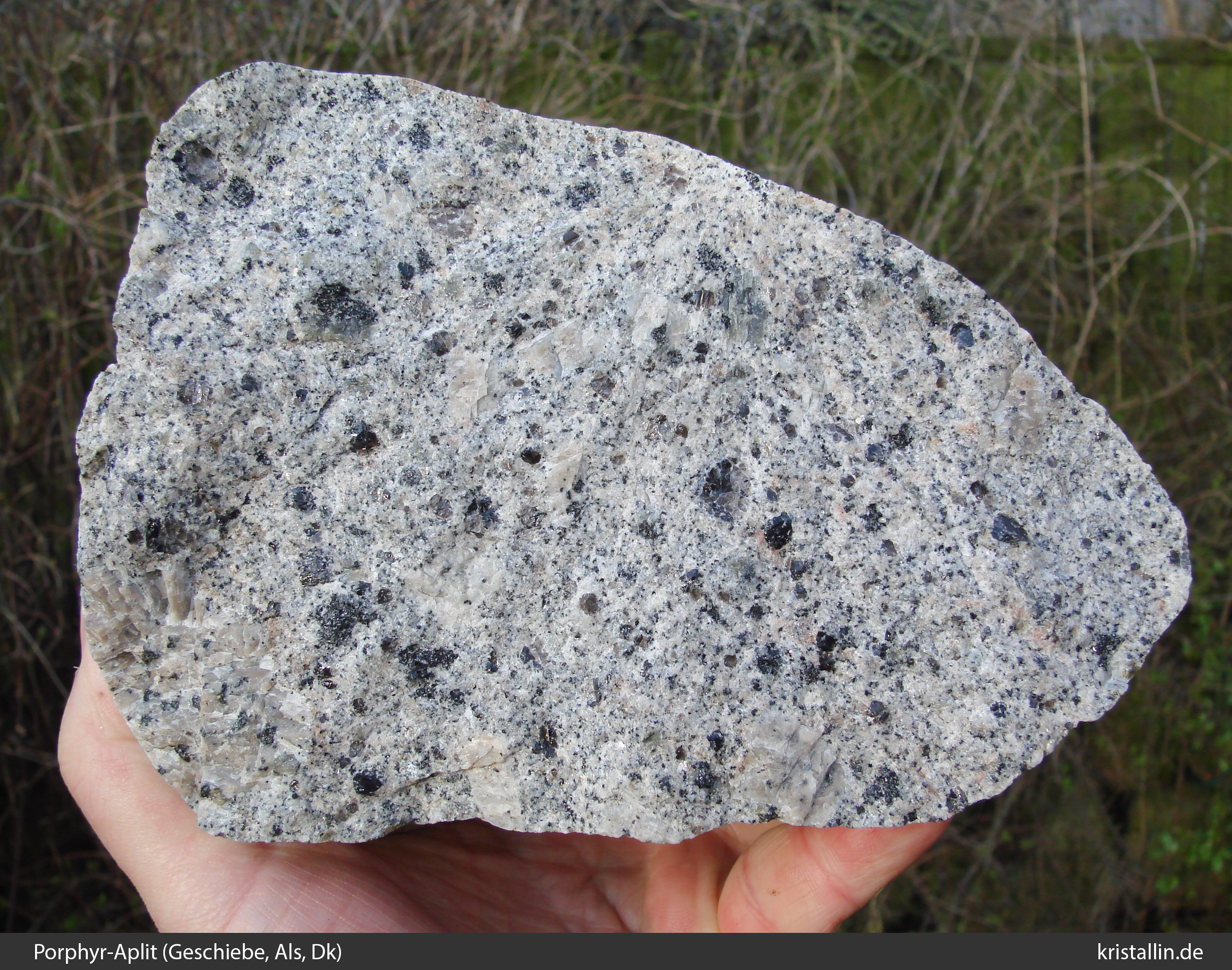 Bei der Beprobung fiel mir auf, dass einige der großen Alkalifeldspäte aus miteinander verwachsenen Kristallen bestehen. So ein glomerophyrisches Gefüge kenne ich aus keinem anderen Porphyr-Aplit in Finnland. Ob sich dieses Merkmal über größere Teile des Ytö-Granits erstreckt und als Merkmal bei der Bestimmung dienen kann, ist unklar. Dazu müsste man das gesamte Vorkommen bei Ytö und anschließend auch alle anderen grauen Porphyr-Aplite untersuchen.