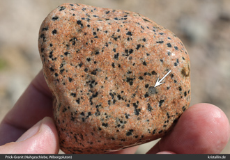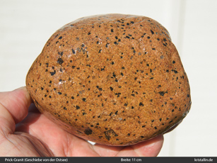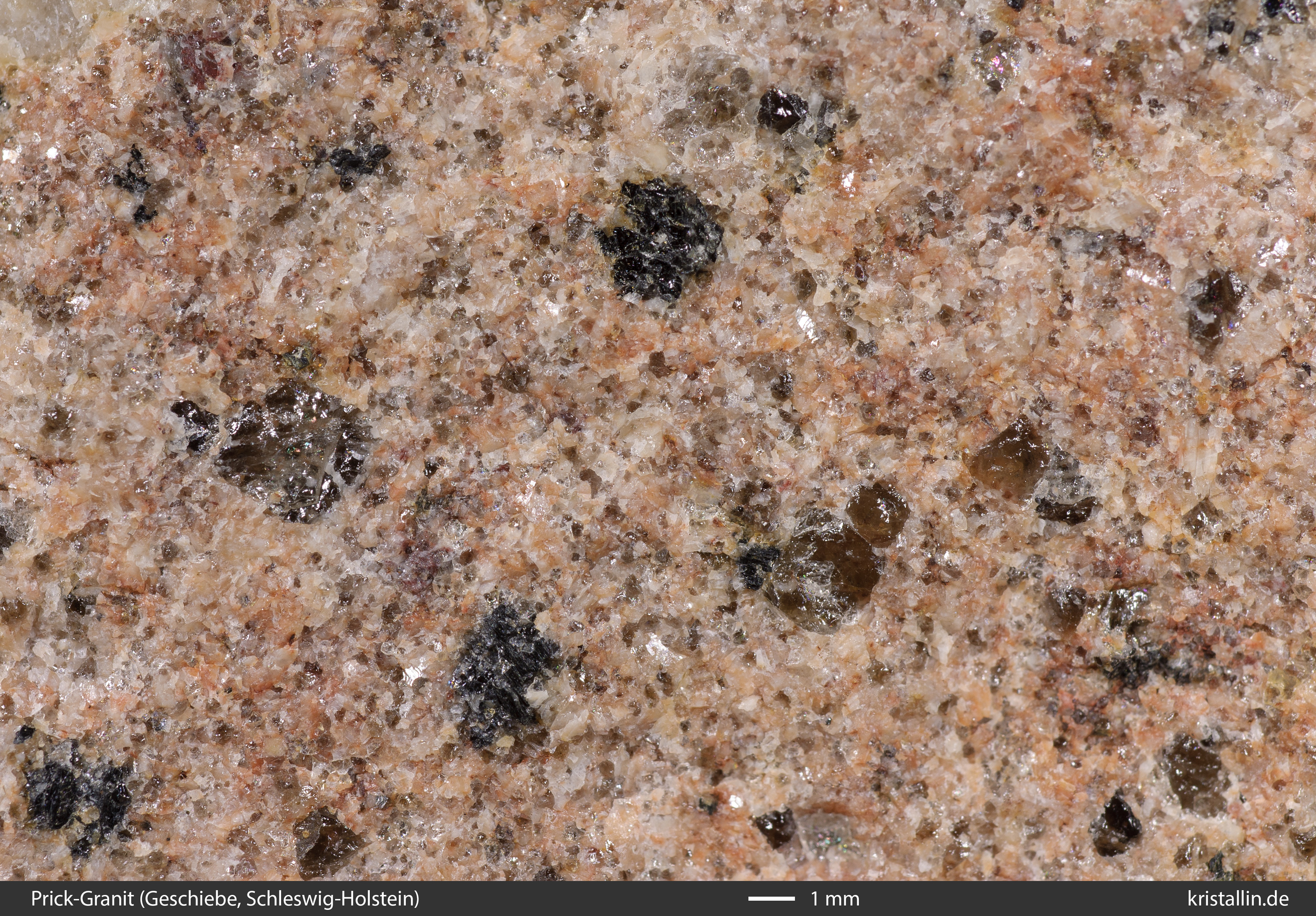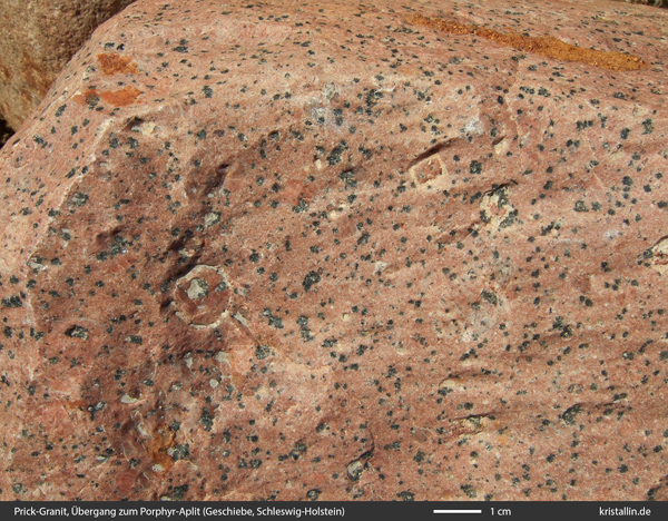 Wegen des gleichkörnigen Gefüges kann die Grundmasse eines Prick-Granits auf den ersten Blick an einen Sandstein erinnern. Aber damit haben diese magmatischen Gesteine natürlich nichts zu tun. Sie sind besondere Gefügevarianten der Rapakiwi-Granite und kommen nur in Skandinavien vor. Alle Prick-Granite, die man in Deutschland findet, stammen aus einem dieser Granitmassive und wurden in den Gletschern der Eiszeiten nach Süden transportiert.