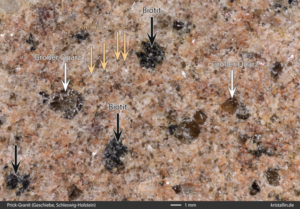 Neben den kleinen Quarzen in der Grundmasse gibt es immer auch einzelne größere Quarze. Der Pfeil im ersten Bild zeigt auf einen solchen. So wie ihre Verwandten, die Wiborgite und Pyterlite, enthalten auch die Prick-Granite zwei Generationen von Quarz: einerseits gerundete Quarze, die mehrere Millimeter groß sind und andererseits viele kleine Quarze in der Grundmasse.