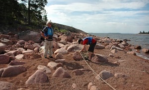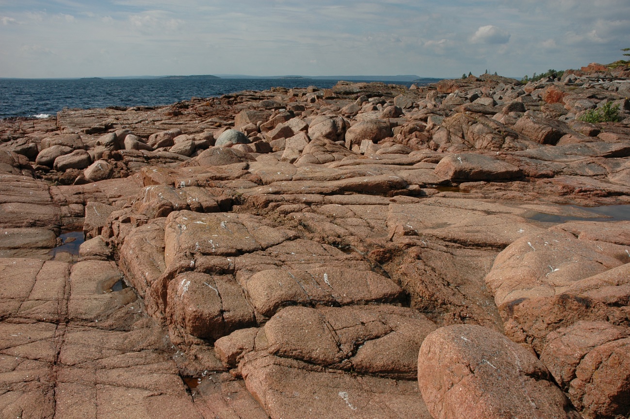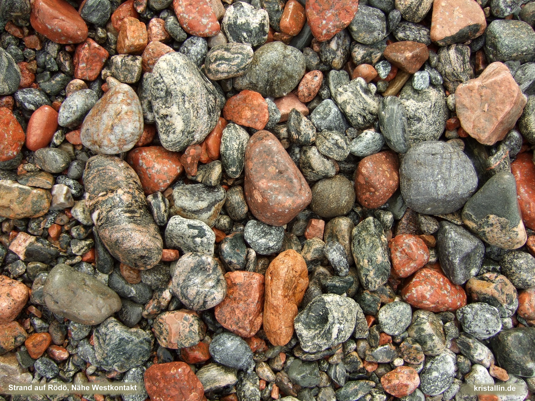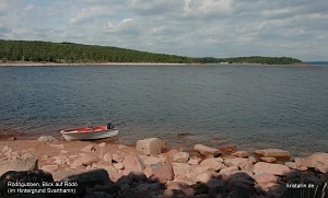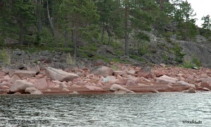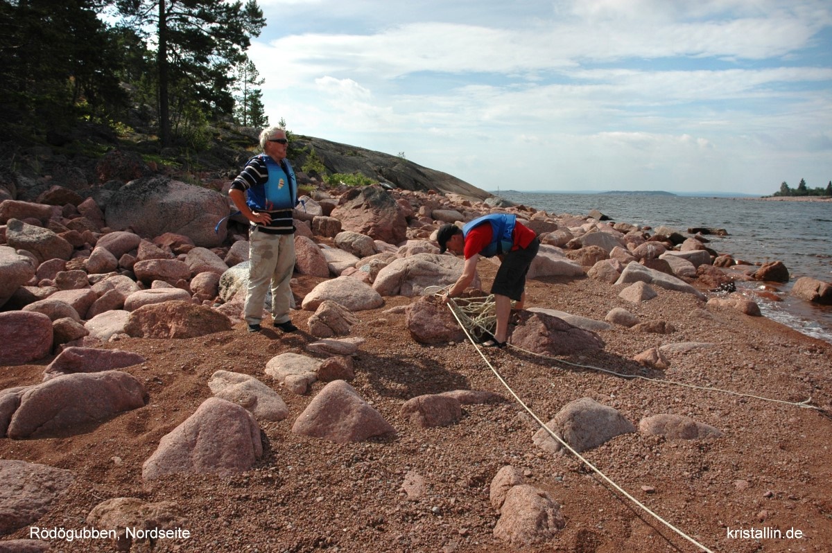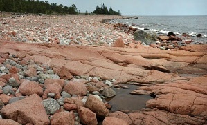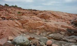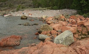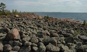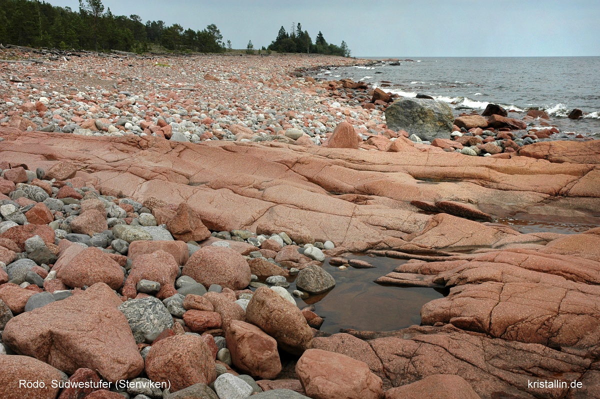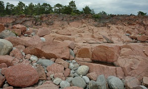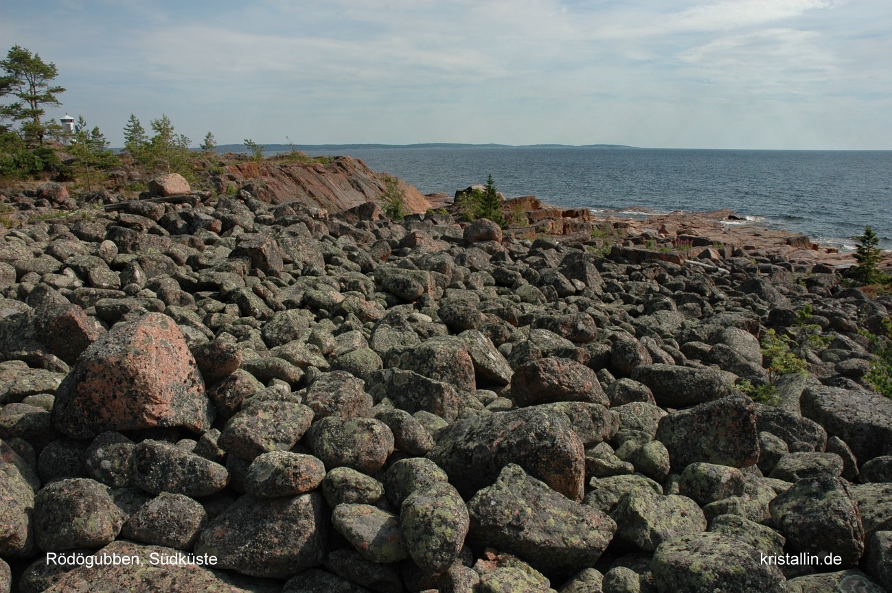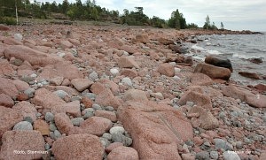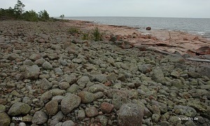Geröllstrand. Im Vordergrund der anstehende Rödö-Rapakiwi.