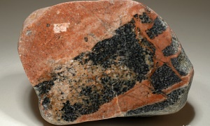 Unten: Brekzie, die beim Eindringen des roten Rapakiwigranits in den Gneis