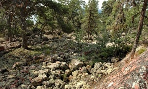 die dauerhaft trocken liegenden Gerölle im Laufe der Zeit von Flechten überwachsen.