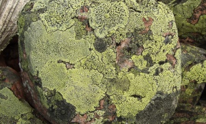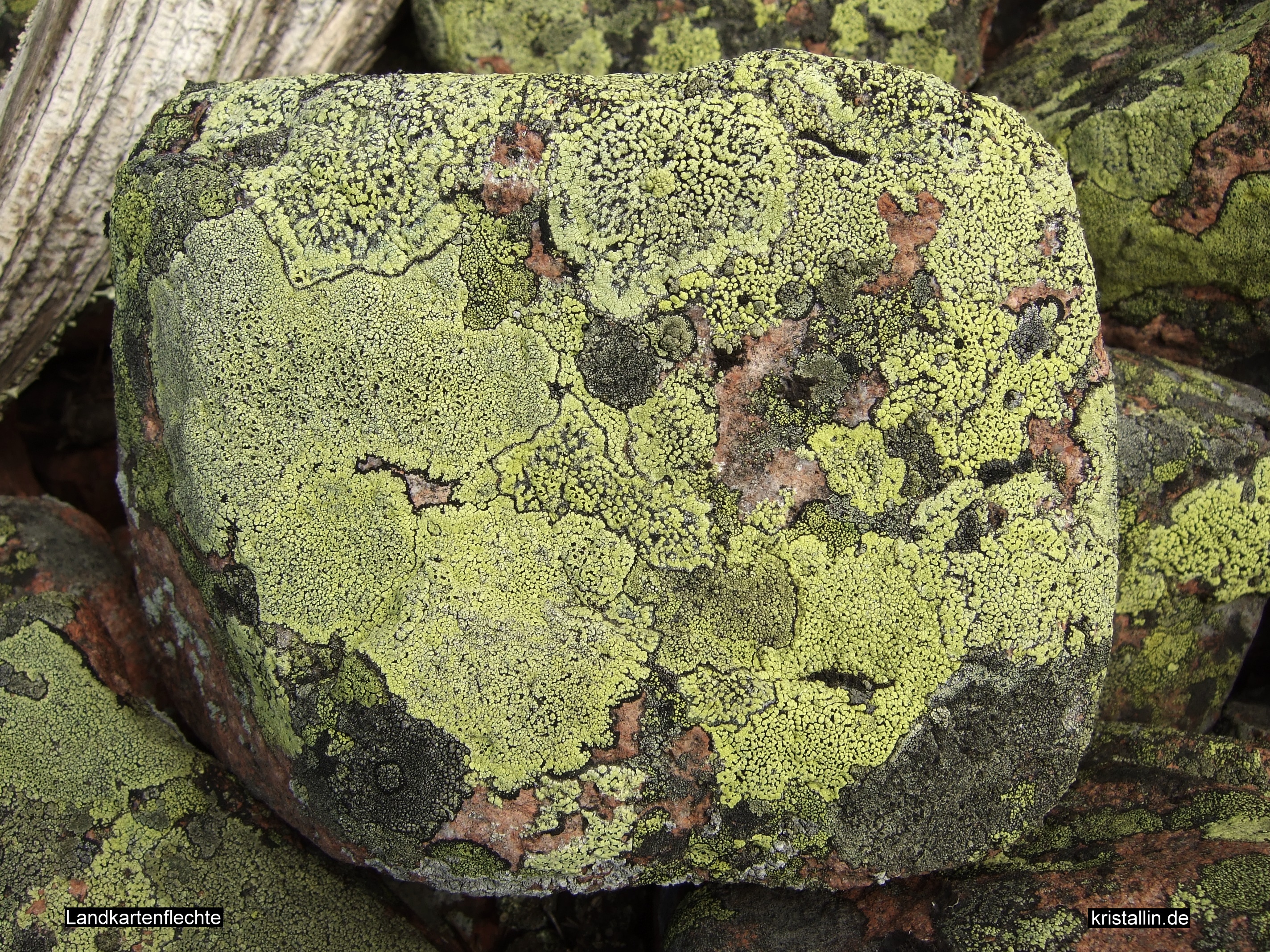 Landkartenflechte (Rhizocarpon geographicum) besiedelt. Der Stein rechts ist etwa 20 cm breit,