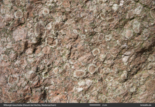 Bei Desum, in der Nähe von Vechta, gibt es einen alten Gerichtsplatz, dessen zentraler Stein so ein Wiborgit aus dem Wiborg-Pluton ist. An seiner Schmalseite sind die großen Ovoide mit ihrem hellen Plagioklassaum gut zu erkennen (Bild 9). Auch dieser Wiborgit enthält zwei Sorten von Quarz.