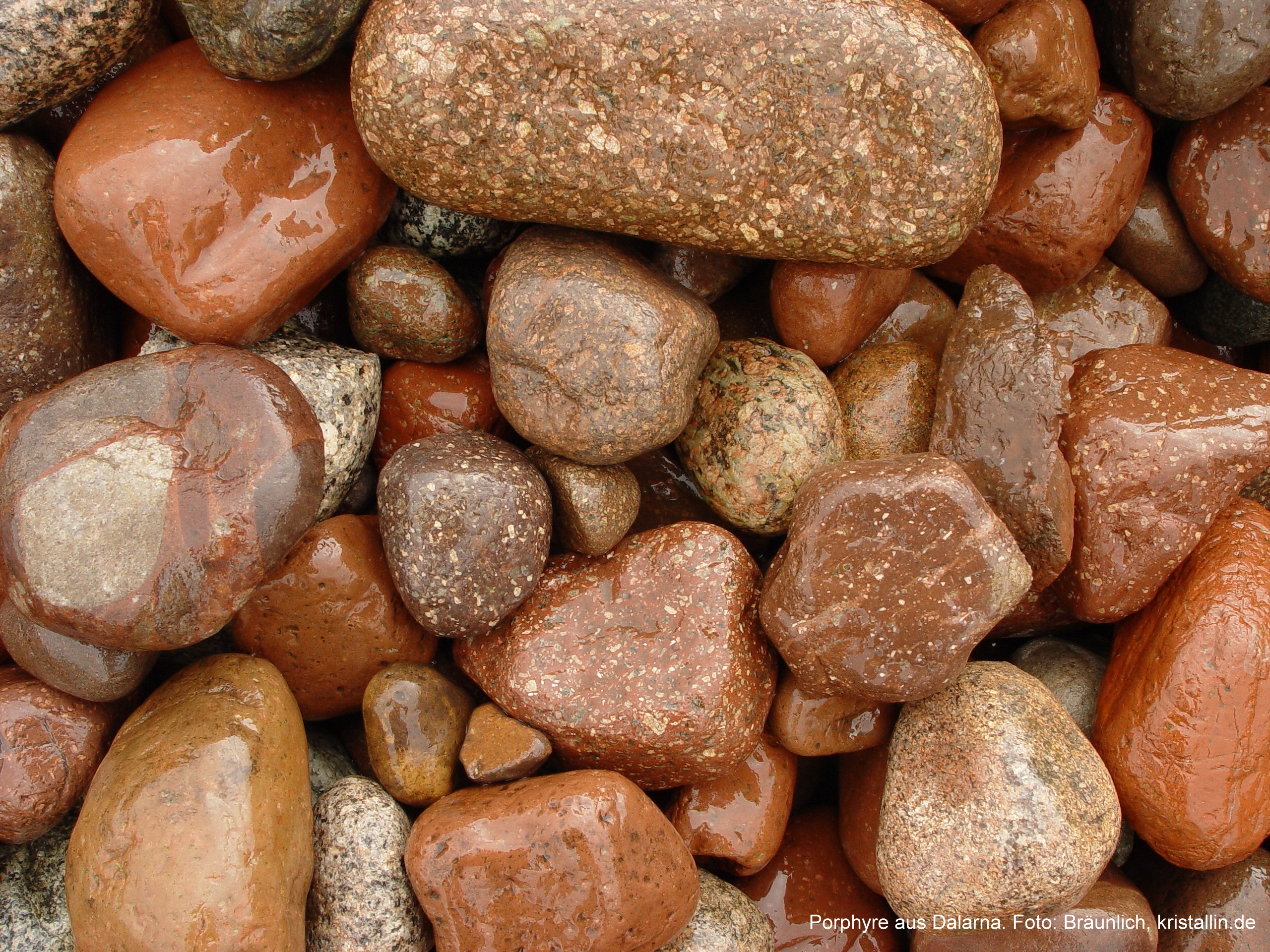 die rotbraune Gesamtfarbe des Geschiebes. Dieser Farbton rührt vor allem vom Bredvad-Porphyr her, der mit großem Abstand das dominierende Gestein