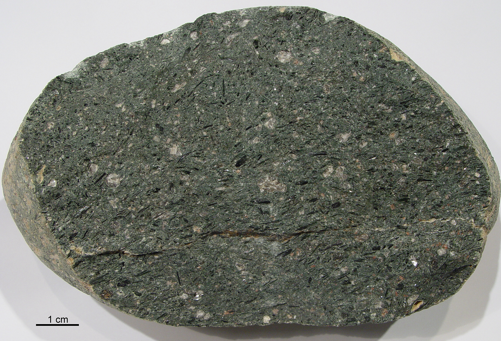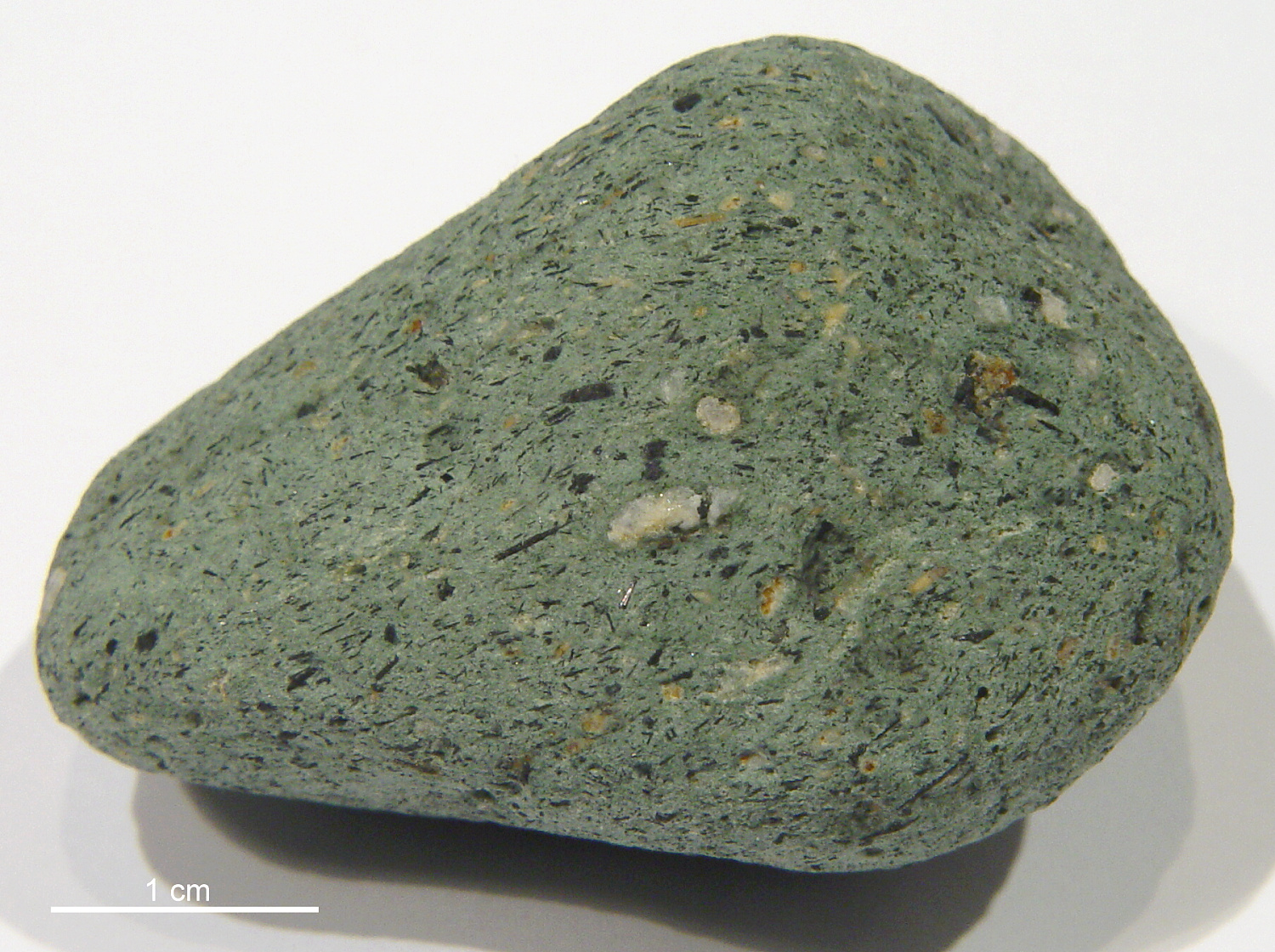Na-Pyroxen!) Außerdem finden sich helle, glasige Feldspäte und gelegentlich Kalzit. Särna-Tinguait ist mit einem Alter von etwa 287 (+/- 14 Ma) Millionen Jahren ganz erheblich jünger als seine svekofennischen Wirtsgesteine. Das Gestein verwittert leicht und bekommt dann eine gelblich-rostige Kruste. Zum Teil ist sie auf den Bildern zu sehen. Särna-Tinguait ist nicht gerade häufig. Es gehört eine Portion Glück zum Finden. Wenn man aber auf grünliche Porphyre achtet, wird man über kurz oder lang Erfolg haben. Alle folgenden Bilder zeigen Geschiebe. Zuerst ein kleines Stück aus der Kiesgrube in Groß Pampau (Schleswig-Holstein), das außer einigen kleinen Ägirinnadeln in grünlicher Grundmasse keine Auffälligkeiten zeigt. Das weiße Mineral ist Kalzit.