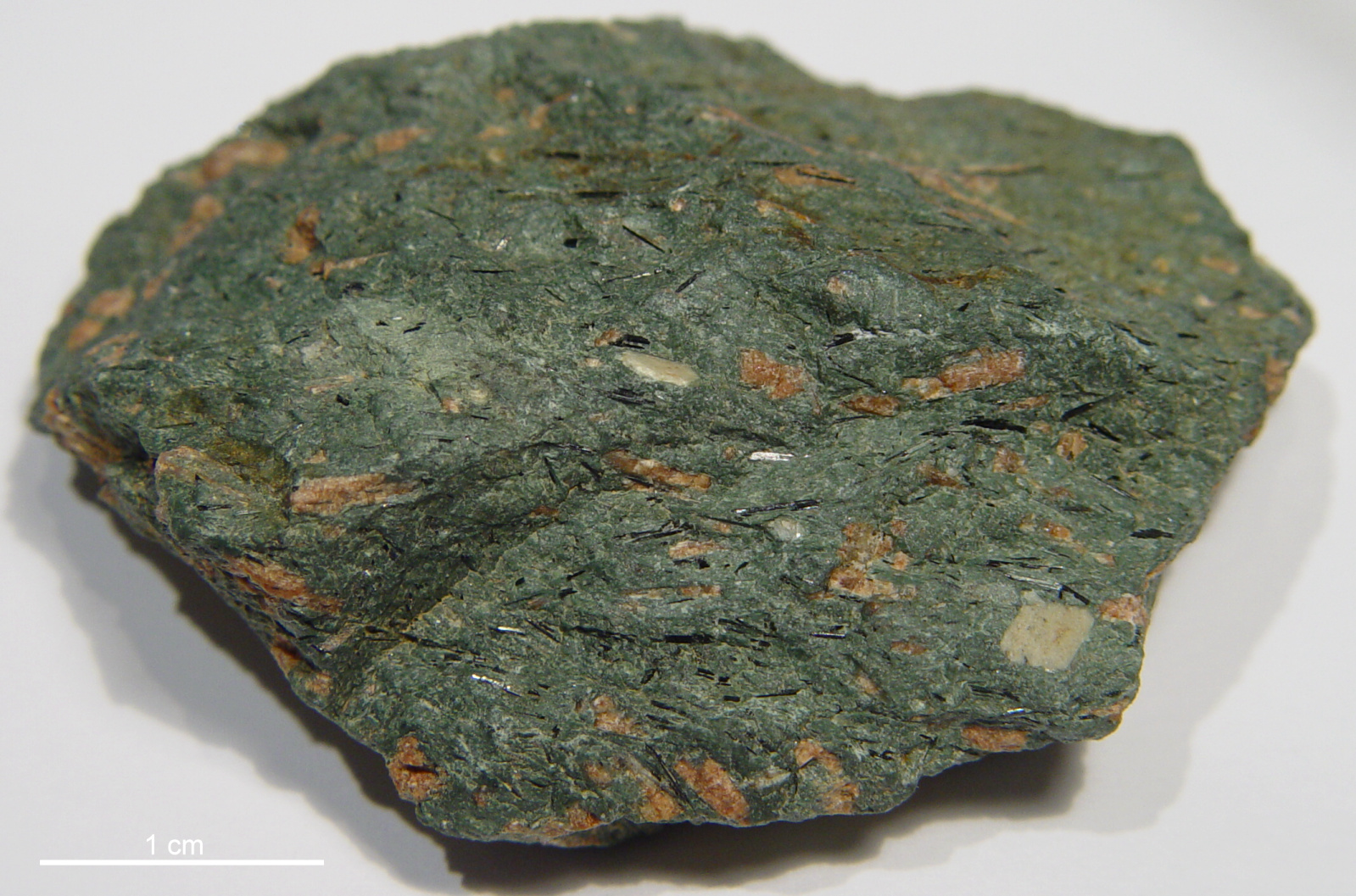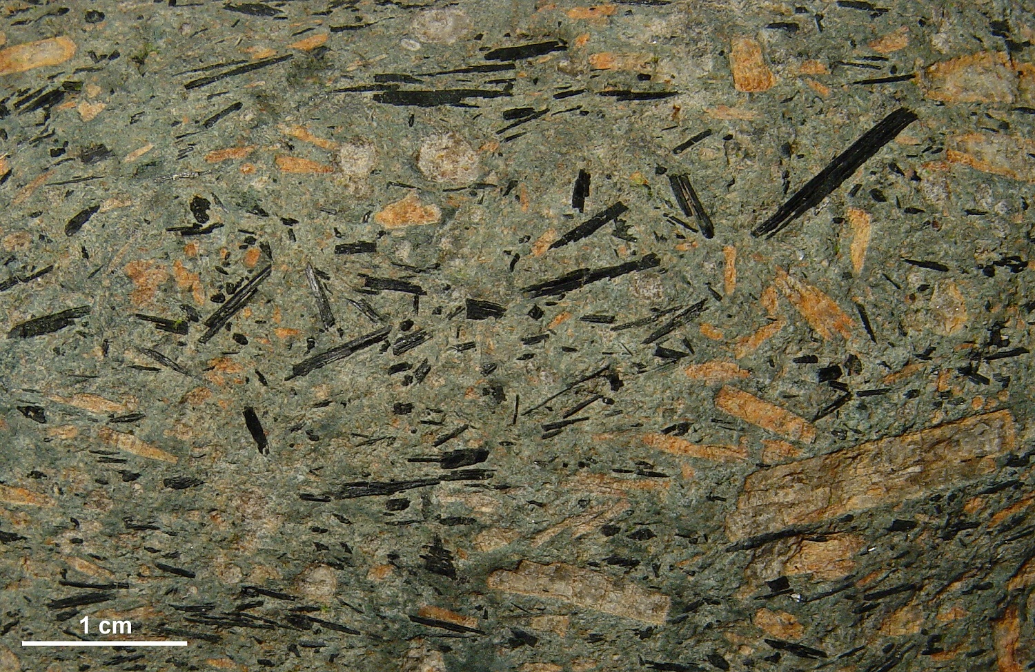 im Nordwesten von Dalarna benannt. Der Tinguait (gesprochen wie geschrieben) ist ein Ganggestein. Er tritt zusammen mit dem Särnait beim Ort Särnaheden am "Siksjöberget" und "Ekorråsen" (beides Bergrücken) auf. Ein Tinguait entspricht chemisch einem Nephelinsyenit. Als Vulkanit/Ganggestein trägt er jedoch eine eigene Bezeichnung. Das Gestein enthält keinen Quarz, dafür neben Alkalifeldspat noch Nephelin und Cancrinit. Letztere sind Feldspatvertreter (Foide), die sich nur in Gesteinen mit Quarzmangel bilden können. Als ganz typisches und auffälliges Mineral finden wir schwarzgrünen Ägirin. Dieser Pyroxen entsteht nur bei Natriumüberschuß und bildet schlanke Nadeln, die sehr oft im Handstück zu sehen sind.