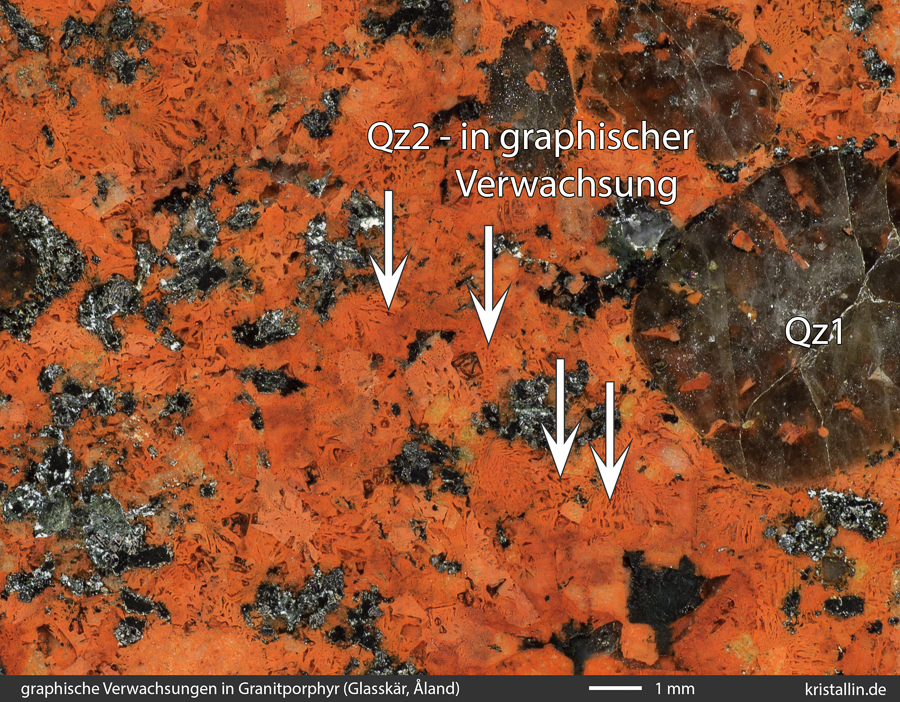 (6/36) Grundmasse eines Ringquarzporphyrs. Hier sind die graphischen Verwachsungen der kleinen Quarze im Alkalifeldspat besonders formenreich. Genau in der Bildmitte ein Quarz als Skelettkristall. (unbeschriftetes Bild)