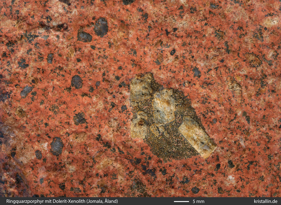 (13/36) Dieser Einschluss ist ein Dolerit, weil seine Grundmasse bereits kleine Feldspäte zeigt. Die größeren Plagioklaskristalle gehören in dieses Gestein. (Ringquarzporphyr, Jomala, Åland)