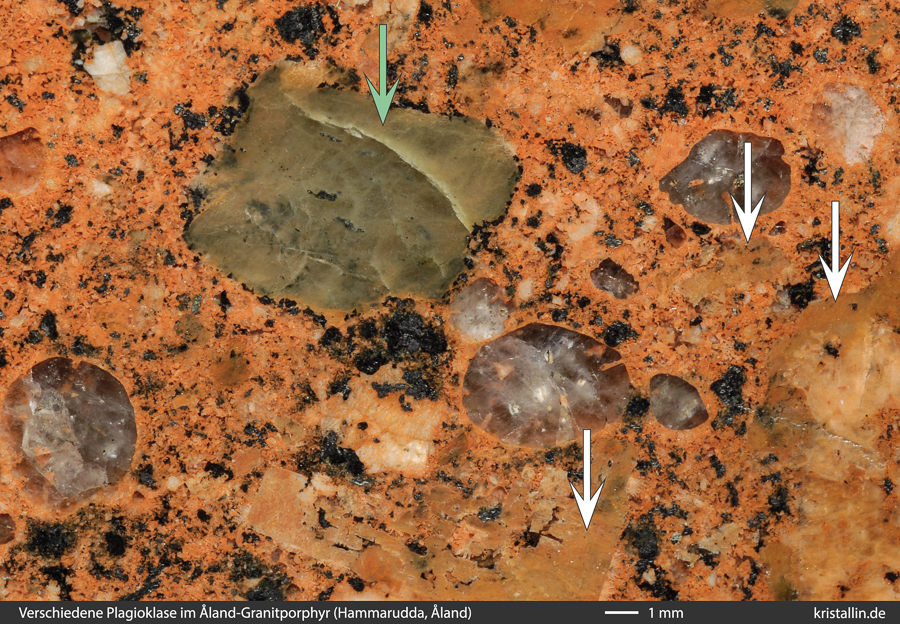 (20/36) Verschiedene Plagioklase in einem Åland-Granitporphyr. (