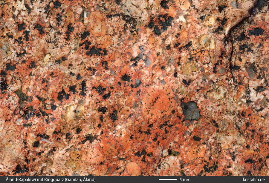 (21/36) Schwarze Säume um die großen Quarze findet man ab und zu auch in den Nachbargesteinen der Porphyre. Hier ist es der anstehende Åland-Rapakiwi im Norden der Hauptinsel.