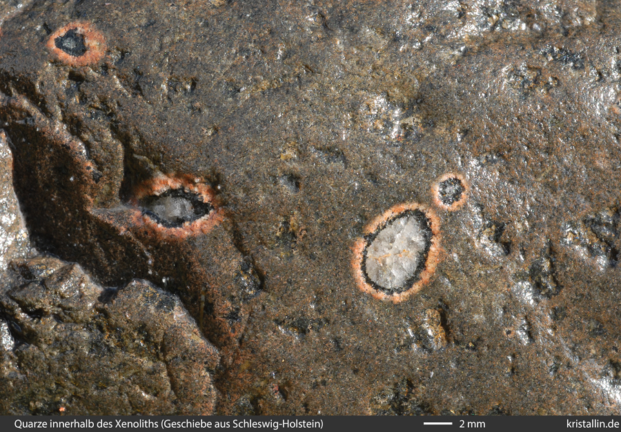 (26/36) Einzelne Quarze im mafischen Einschluss. Jeder Quarz hat den schwarzen Saum und dazu noch rötlichen Feldspat darüber.