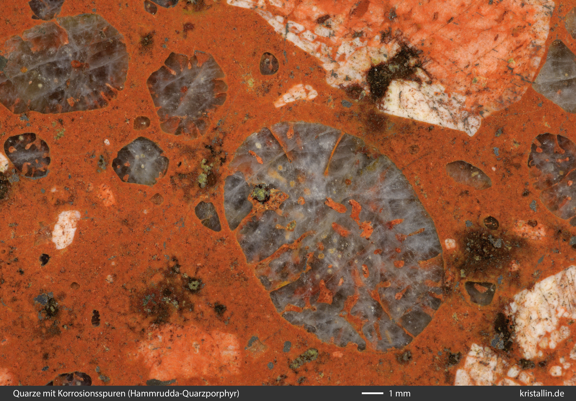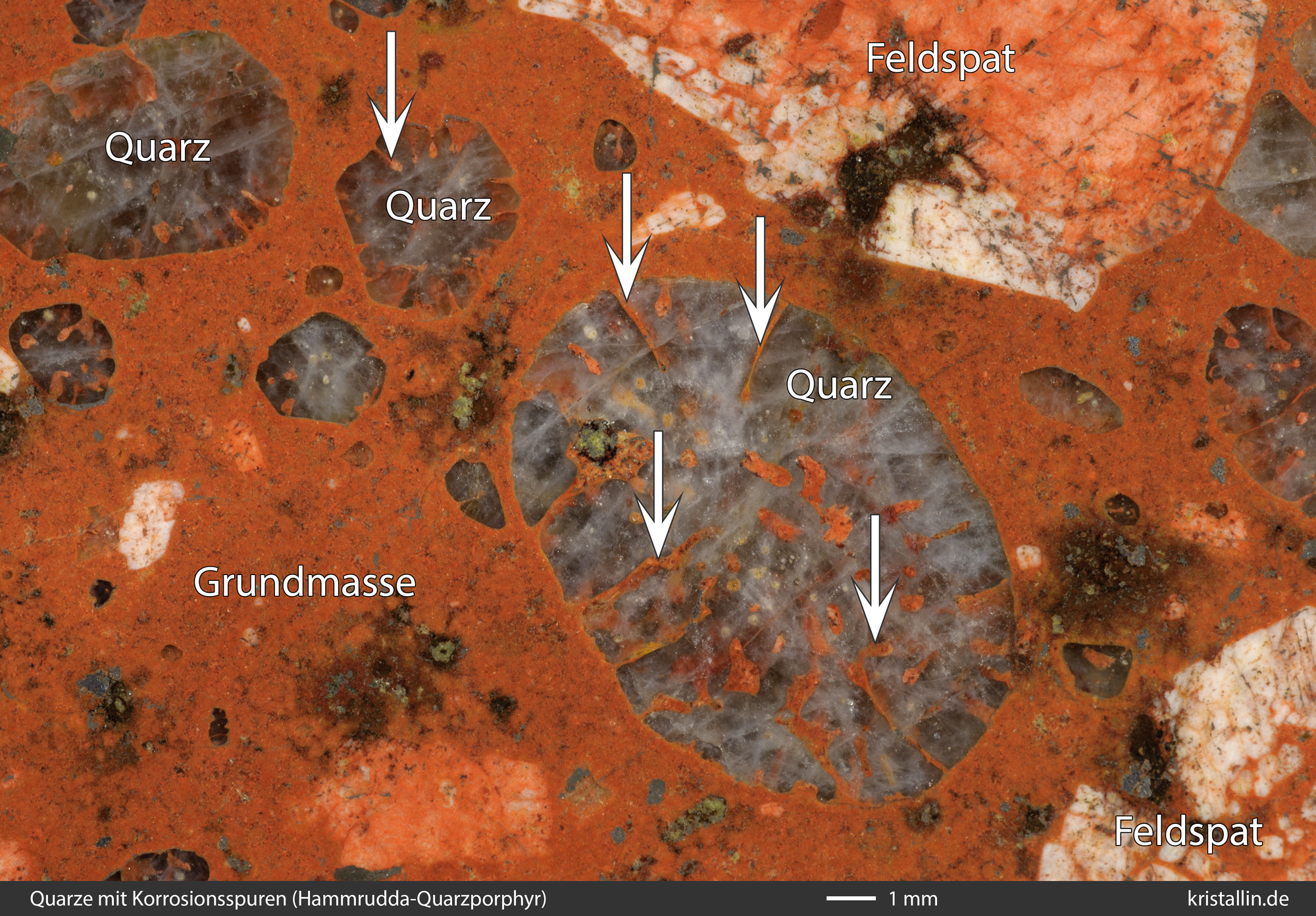 Die Quarze der Åland-Porphyre sind überwiegend hell- bis dunkelgrau, gelegentlich transparent und manchmal milchig-weiß bei einem Durchmesser von 2 bis 5 mm. Fast alle Quarze sind gerundet und haben auf ihren Außenseiten kleine Einbuchtungen. Das ist „Lochfraß“ als Folge magmatischer Korrosion. (Dazu gleich mehr.)