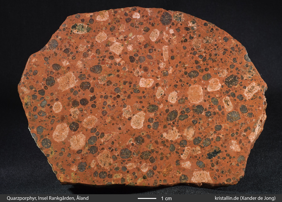 (5/29) Zwischen diesem Porphyr und dem ganz ähnlich aussehenden vom vorigen Bild liegen mehrere Kilometer Abstand. Die Insel Rankgården befindet sich ganz am östlichen Ende des Quarzporphyrganges von Hammarudda. Auf der Strecke dazwischen gibt es ganz verschiedene Porphyrgefüge, einschließlich des viel grobkörnigeren Hammarudda-Quarzporphyrs. Auch wenn dieser Gang unterschiedliche Gefüge enthält, so ist seine Größe insgesamt für Porphyre ungewöhnlich. (Eine Karte dazu finden Sie unterhalb.)