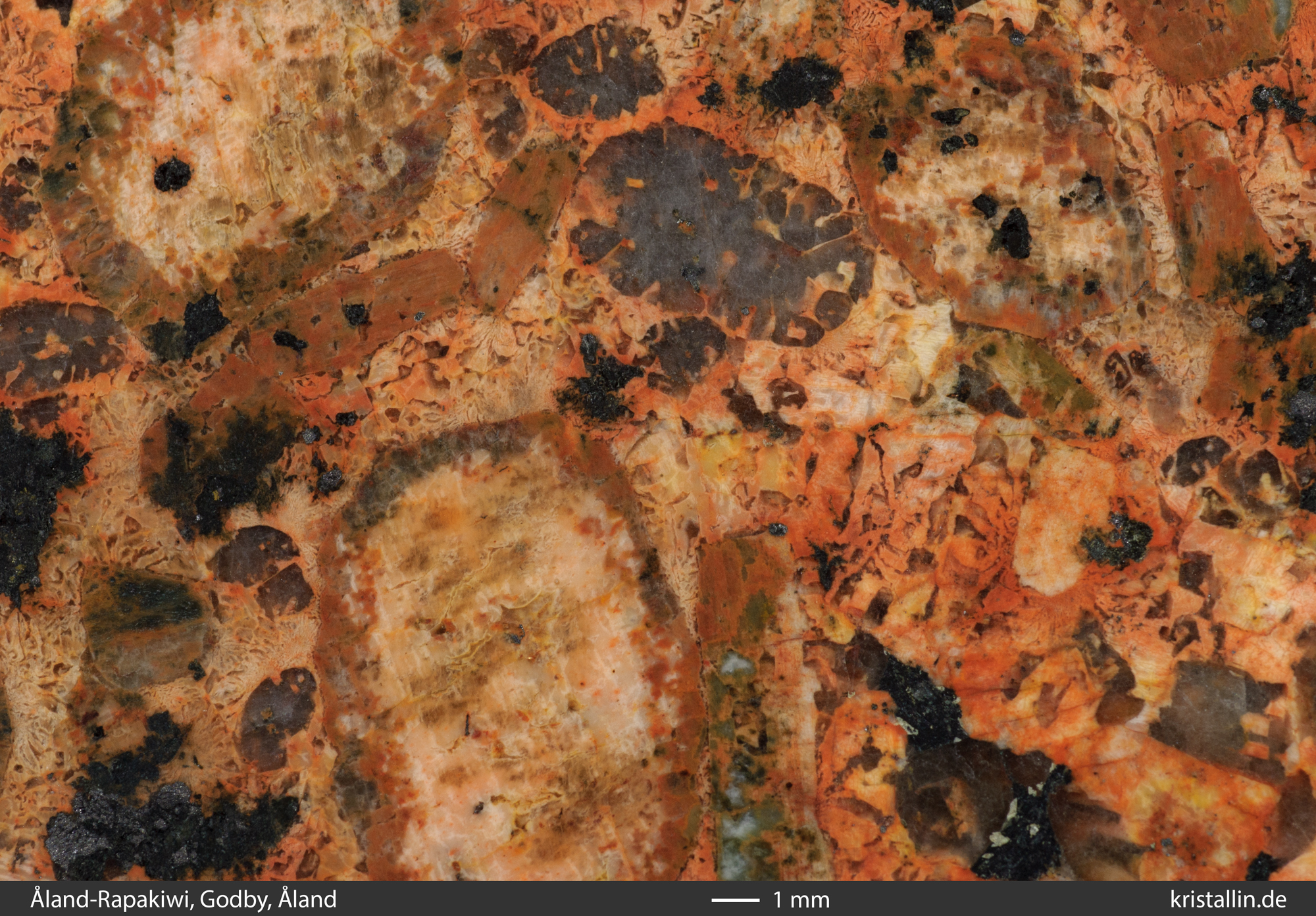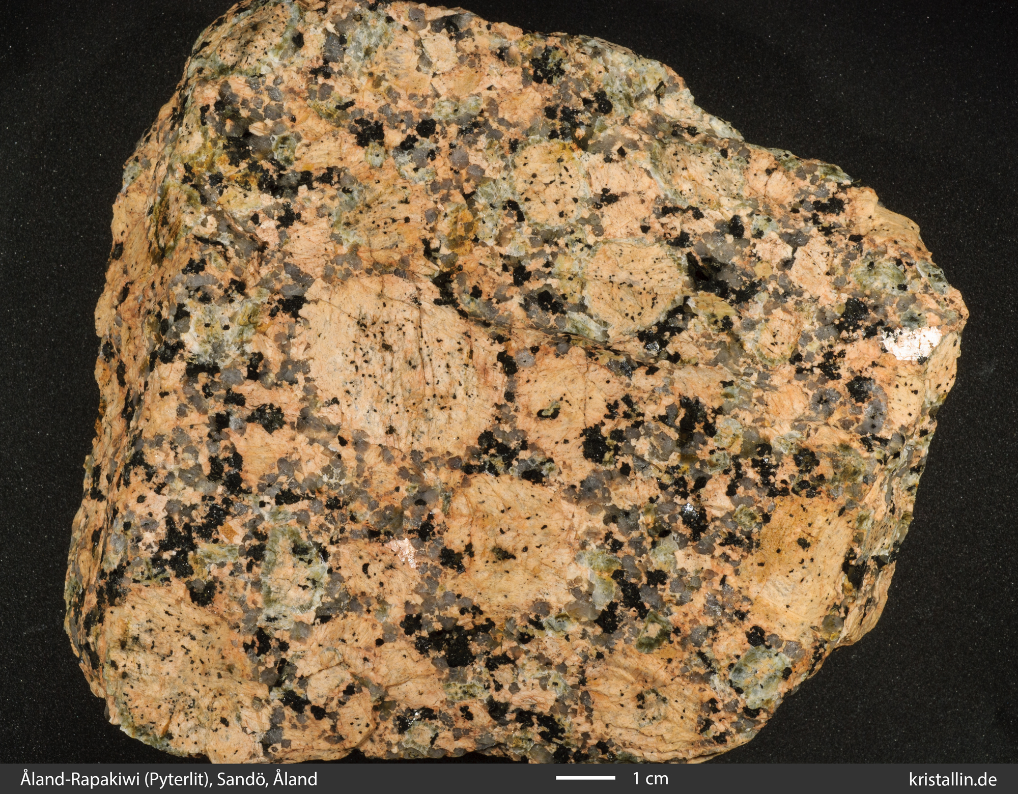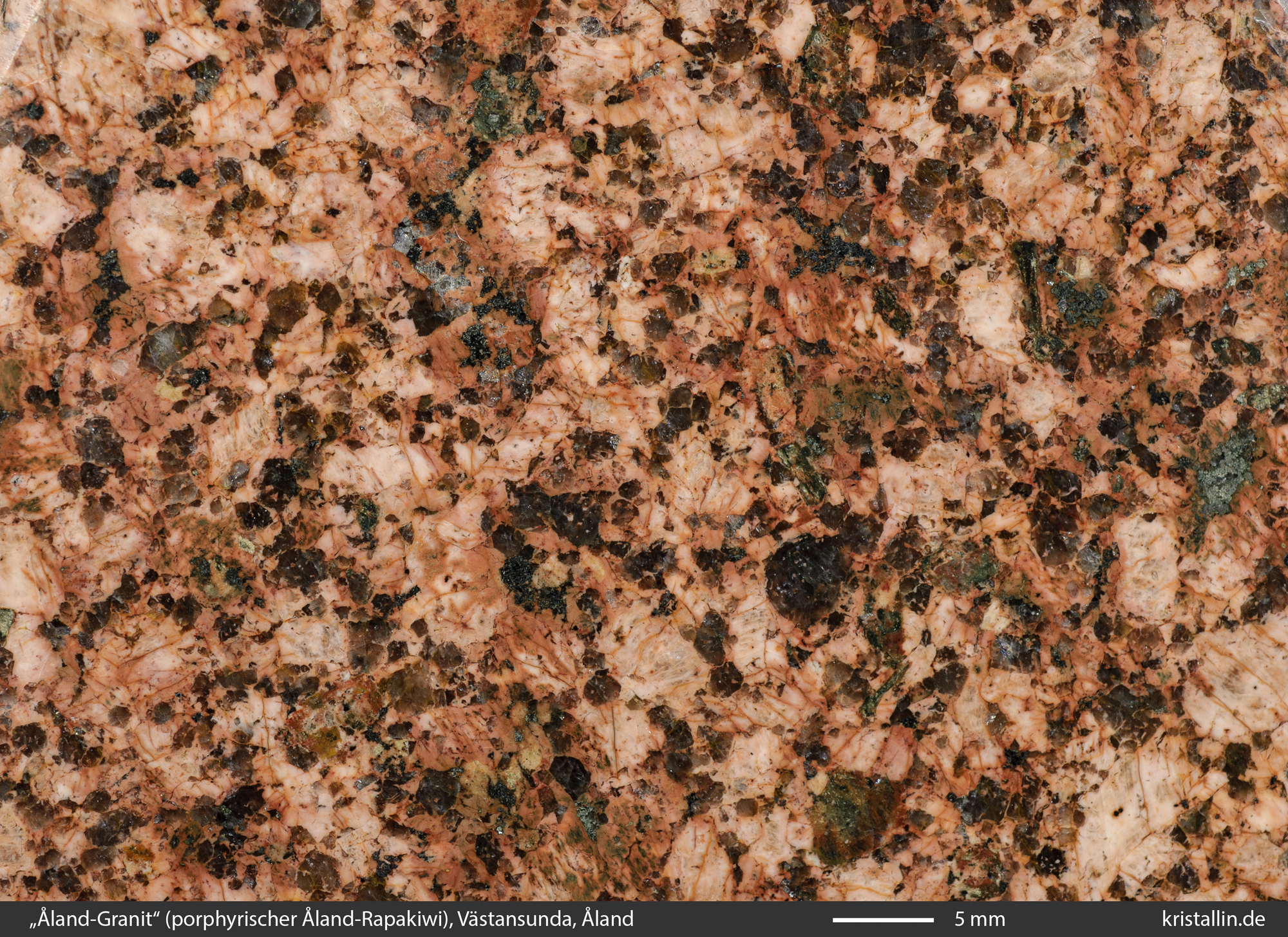 Die wichtigsten Gefüge im Granitmassiv von Aland sindWiborgit (runde Feldspäte mit Saum),