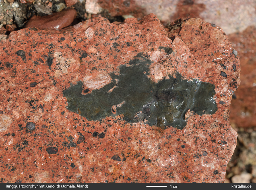 (7/14) Ringquarzporphyr mit schwarzem Xenolith. Dessen eingebuchteter Rand zeigt, dass beide Partner weich und fließfähig waren.
