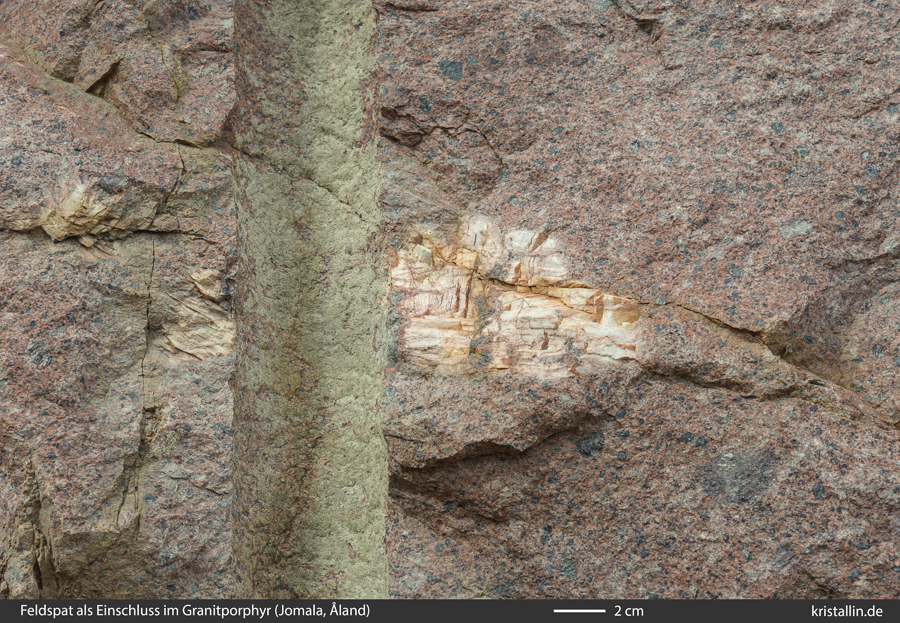 (8/14) Eine Bohrspur aus der Nähe (grünlich). Hier geht es aber um das, was rechts daneben zu sehen ist: Ein großer Feldspat. Um so ein großes Exemplar als Einschluss zu erhalten, musste ein ziemlich grobkörniger Granit in die Schmelze geraten sein - ein Pegmatit.
