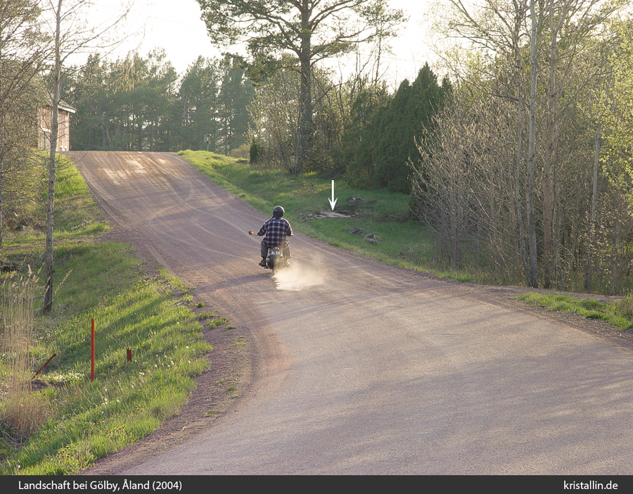 (11/14) Gölby, 2004. Das Bild zeigt den Ortsrand, wo ich bei meiner zweiten Ålandexkursion versuchte, den Quarzporphyr von Gölby zu finden. Das erforderte viel Zeit und Suchen, denn geologische Karten waren damals nur als gedruckte Papierkarten zu bekommen. Karten im Internet gab es noch nicht und auch keine mobile Verbindung ins Netz, mit der man sich große Dateien hätte ansehen können. Außerdem war damals noch ein Laptop eher ein Schlepptop. So war ich schon froh, als ich den kleinen ebenerdigen Fels fand, der sich als schöner Quarzporphyr entpuppte (Pfeil).