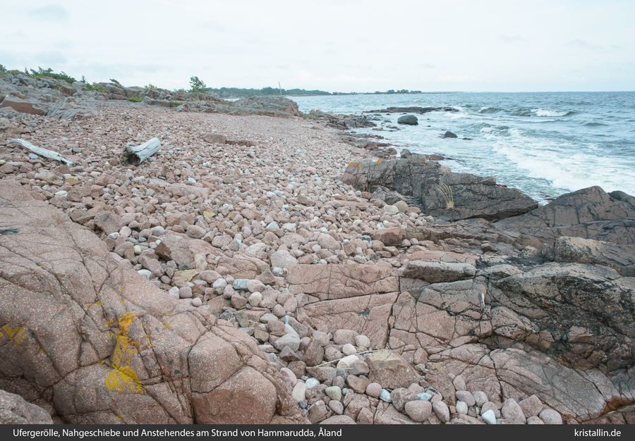 (6/100) In einigen Buchten haben sich Gerölle gesammelt. Die meisten sind anstehendes Gestein - also Quarzporphyr, der von der Brandung abgerollt wird. Dazwischen liegen Nahgeschiebe, die von weiter nördlich stammen. Dabei handelt es sich meist um Rapakiwigranite sowie einige svekofennische Gesteine, die rechts und links vom Quarzporphyrgang anstehen. Einige können auch Ferngeschiebe von sehr viel weiter nördlich sein.