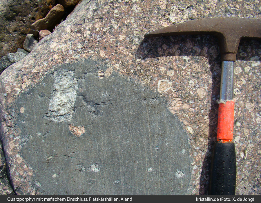 Der große dunkle Einschluss enthält nicht nur einen großen Plagioklas, sondern auch rötliche Feldspäte. Die kommen aus dem umgebenden Porphyr und belegen eine Mischung der Magmen.
