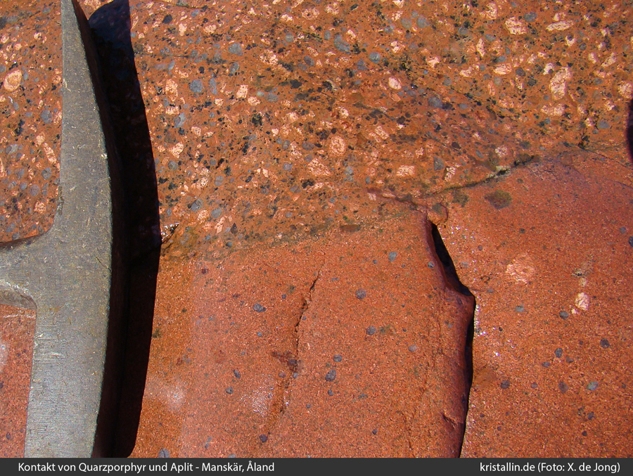 (50/100) Kontakt zwischen Quarzporphyr und dem feinkörnigen Aplit auf Manskär. Die großen gerundeten Quarze gibt es in beiden Gesteinen.