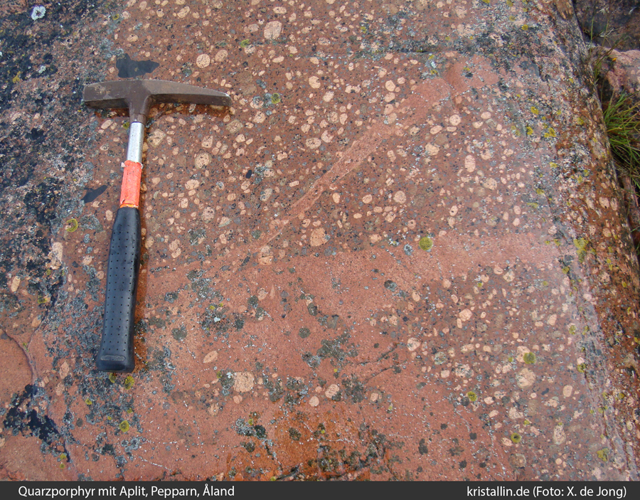 (62/100) Hier durchzieht feinkörniger Granit (Aplit) den Quarzporphyr. Natürlich ist der Aplit jünger, sonst könnte er keine Gänge bilden. Außerdem teilt der Aplit mehrere Feldspäte im Quarzporphyr. (In der Vergrößerung erkennbar.)