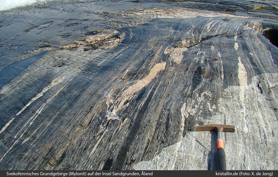 (86/100) Dramatische Folgen einer lange zurückliegenden Gebirgsbildung. Derart stark verformte und parallel ausgewalzte Gesteine werden als Mylonite bezeichnet. Sie zeichnen sich durch ein feinkörniges Gefüge und eine straffe Foliation bei großer Härte aus.