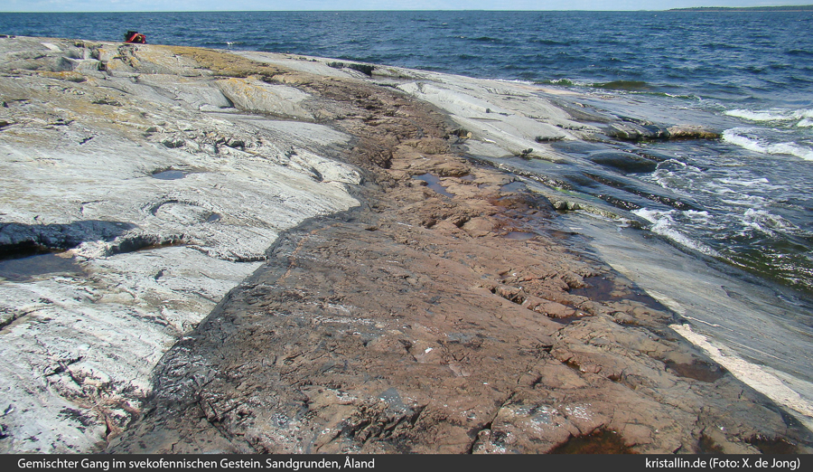 (87/100) Quer durch den Mylonit hat sich ein dunkelbrauner Gang seinen Weg gebahnt.