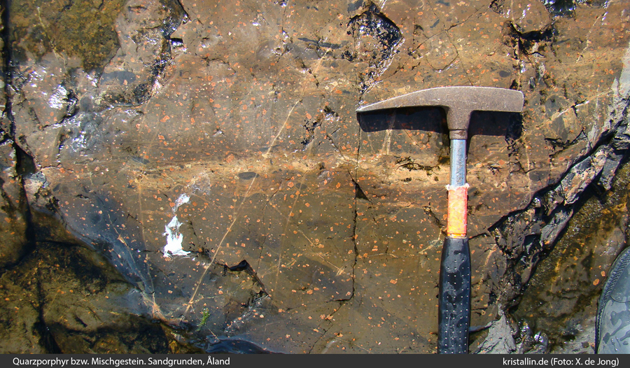 (90/100) Der Gang, nun endlich mit nasser Oberfläche. Die rötlichen Flecken sind keine Plagioklase, sondern Alkalifeldspäte. (Das Weiße stammt von Vögeln und gehört nicht zum Gestein.)