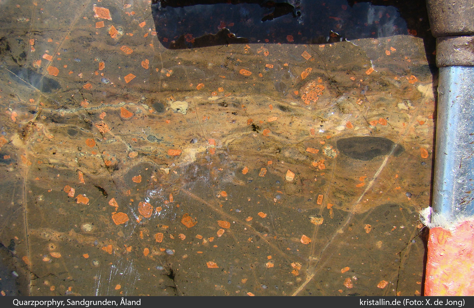 (91/100) Jetzt sieht man auch, dass es außerdem kleine hellgraue Quarze gibt. Das ist ein Quarzporphyrgang. Die Strukturen darin bilden die Fließbewegung in der Schmelze ab.