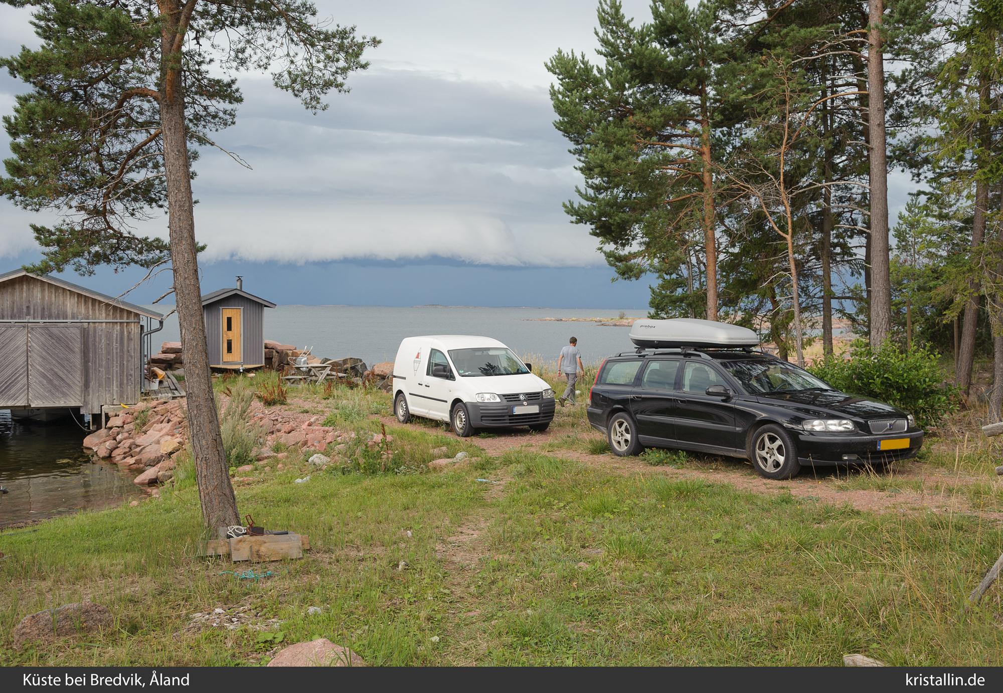 (3/99) Unsere Exkursion beginnt auf der namenlosen Insel bei Bredvik, die im Bild rechts hinter den Bäumen liegt. Dazu wurden wir von den Eigentümern eingeladen, denn auch dort ist alles Privatbesitz. Leider kam uns ein Gewitter in die Quere. Der Wolkenstreifen im Hintergrund ist der Böenkragen an seiner Vorderseite. Wenn der so nah ist wie hier, wird es höchste Zeit, seine Sachen zu verstauen.