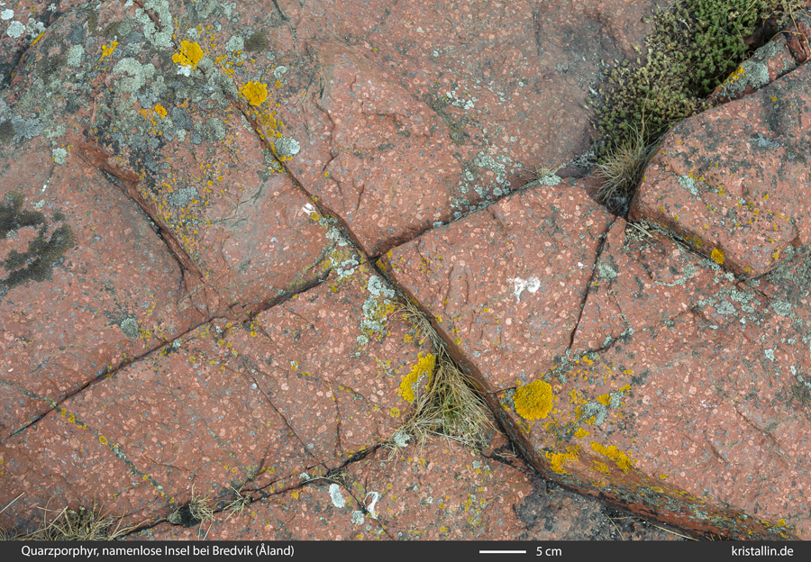 (6/99) Typisch für Vulkanite ist die geringe Kluftweite, also ein kurzer Abstand zwischen den natürlichen Rissen im Gestein. Dieser Abstand entscheidet auch darüber, wie groß Geschiebe sein können. Bei den Quarzporphyren von Åland ist das nicht viel und deshalb gibt es diese Porphyre (wie so viele andere auch) nicht als große Geschiebe.