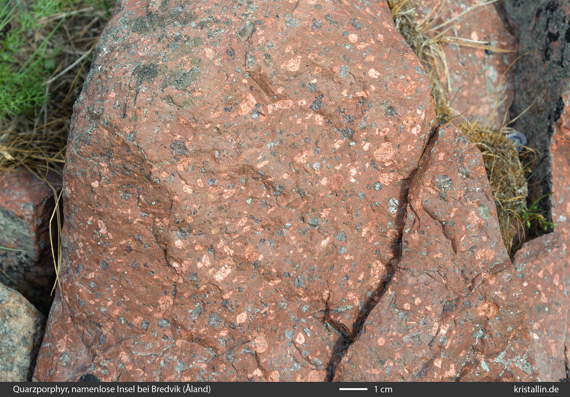 (7/99) Etwas näher dran. Man kann die hellen Feldspäte, die grauen Quarze und die Grundmasse erkennen.