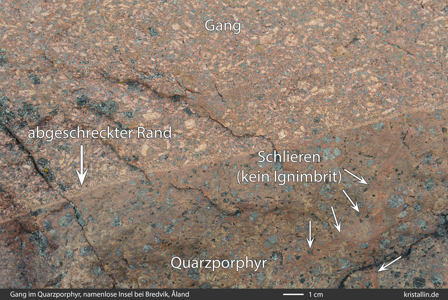 (10/99) Mit Beschriftung. Unten rechts enthält der Wirtsporphyr einige Schlieren. Auch das ist nichts Besonderes und hat nichts mit Ignimbriten zu tun. Das hier ist massiger Quarzporphyr.