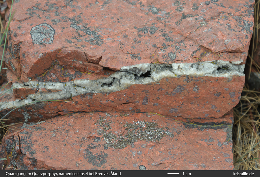 (12/99) An einigen Stellen gibt es Hohlräume mit kleinen Quarzkristallen darin. Solche Drusen bilden sich nur dann, wenn der Gang Flüssigkeit enthält. Reiner Quarz kann in natürlichen Magmen keine fließfähige Schmelze bilden, denn dazu ist sein Schmelzpunkt viel zu hoch. Aber Fluide (Wasser und CO2) können viel gelösten Quarz aufnehmen und sind bei hohem Druck und hoher Temperatur extrem beweglich. Es sind die Fluide, die solche Gänge schaffen und sie auch füllen.