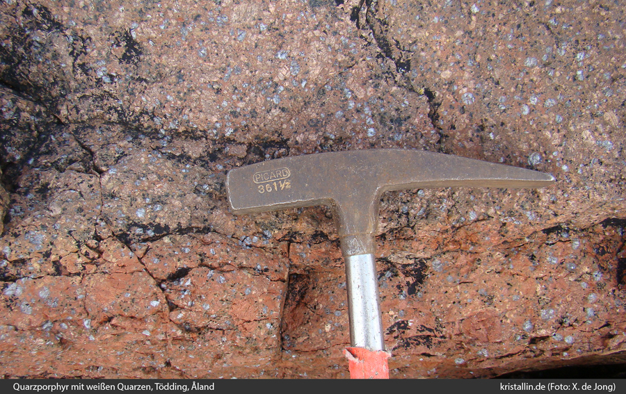 (24/99) Einer der auf Tödding anstehenden Quarzporphyre. Zwar gibt es verschiedene Färbungen (oben braun, unten rot), aber in beiden Gefügen fallen die hellen Quarze auf.