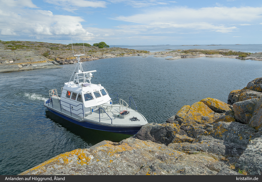 (34/99) Da es nirgendwo Stege gibt, braucht man zum Anladen ausreichend tiefes Wasser. Das Schiff wird mit dem gummigepolsterten Bug an die Felsen gedrückt.