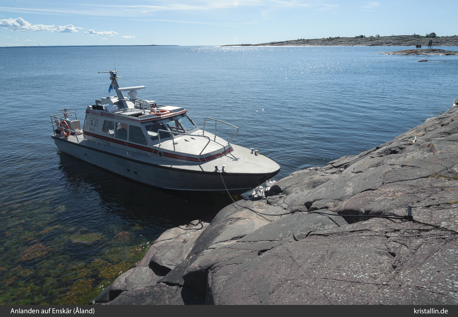 (48/99) Hier gibt es wieder tiefes Wasser mit steilen Uferfelsen. Dies ist das Boot von Bengt Granberg. Er benutzte Behelfsanker, die wir in die Spalten eingeschlagen haben. So geht es auch.