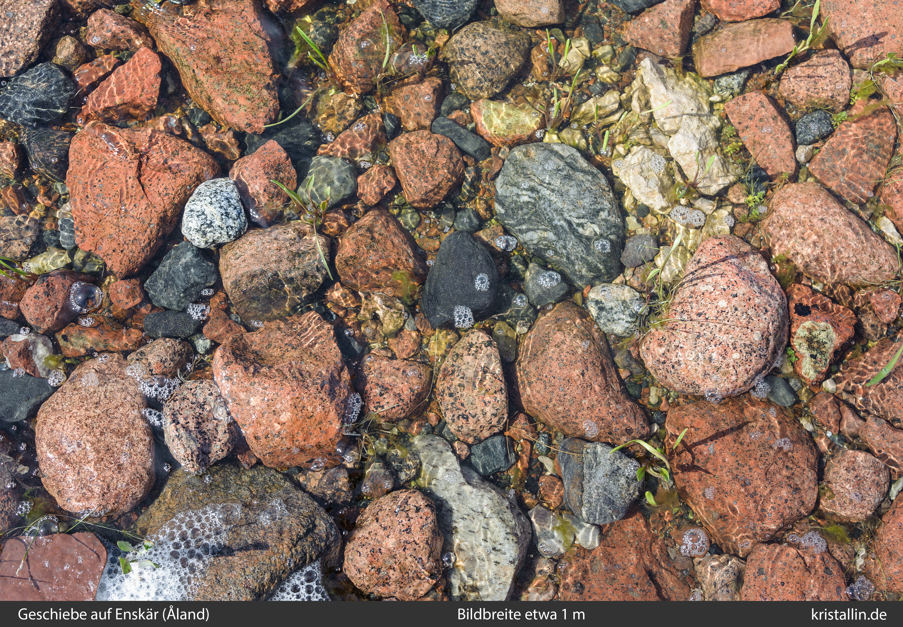 (53/99) Ein Blick ins flache Wasser. Vieles hier gehört zwar zum Ålandpluton, stammt aber aus dem unter Wasser liegenden Gebiet nördlich von hier. Da sich die Gletscher hier genau nach Süden bewegten, haben wir nur diese Geschiebe, um etwas über den Westen des Ålandplutons zu erfahren. Weiter südlich ist nur noch Ostsee. Deshalb sind wir so scharf auf die Nahgeschiebe. (Bild ohne Beschriftung)