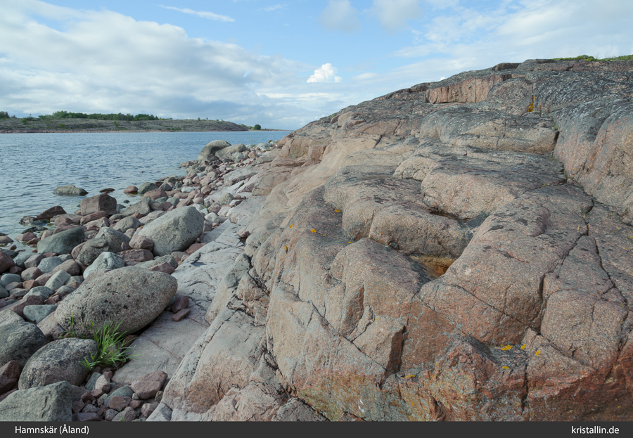 (57/99) Nächste Insel, weiter südlich: Hamnskär. Schon vom Boot aus war zu sehen, dass es auch hier saubere Geschiebe gibt. Am großen Findling, der hinten am Wasser liegt, konnten wir anlegen.