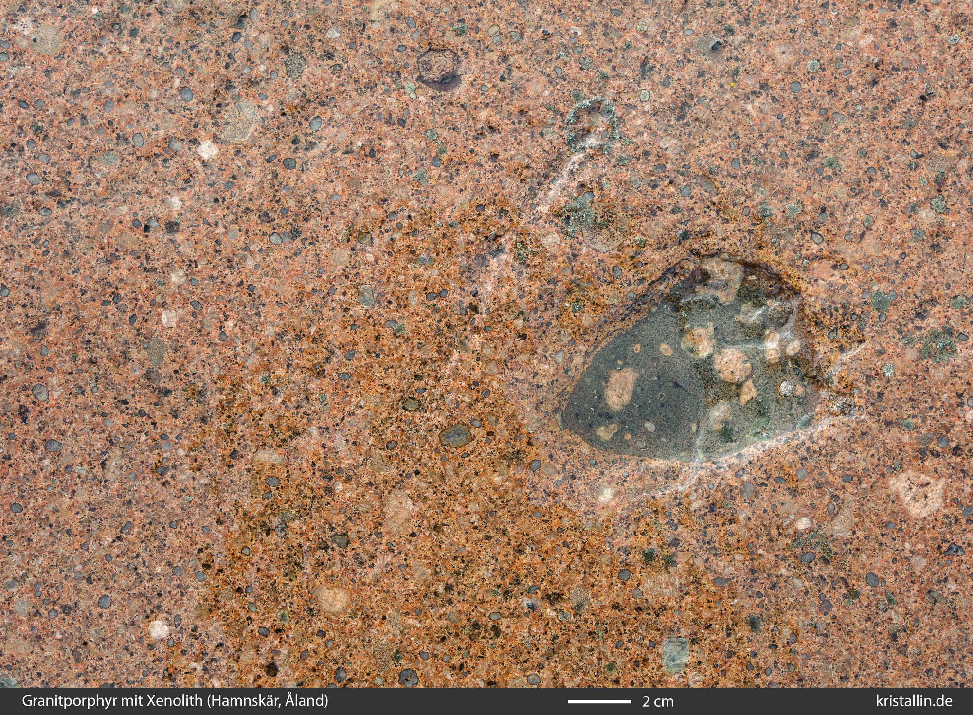 (59/99) Wieder einer der vielen mafischen Xenolithe mit Feldspäten darin. Einzelheiten zu dieser Magmenmischung im Text zu den Granitporphyren.