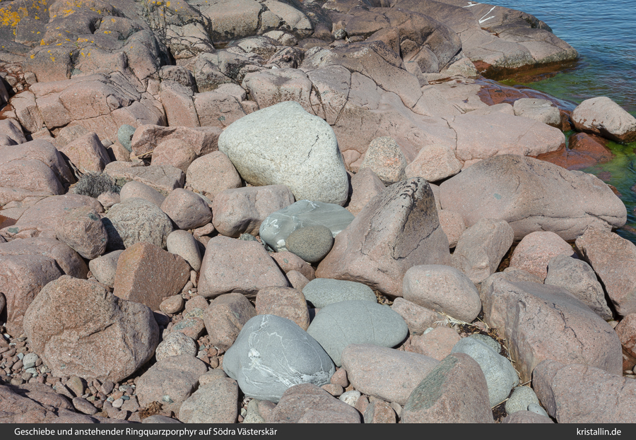 (70/99) Graue Geschiebe sind immer Ferngeschiebe, wenn es keine Dolerite sind. Die stammen meist (müssen aber nicht) aus dem Ålandpluton. Der Migmatit im Vordergrund hat natürlich ein svekofennisches Alter, so wie alle metamorphen Gesteine hier in der Gegend.