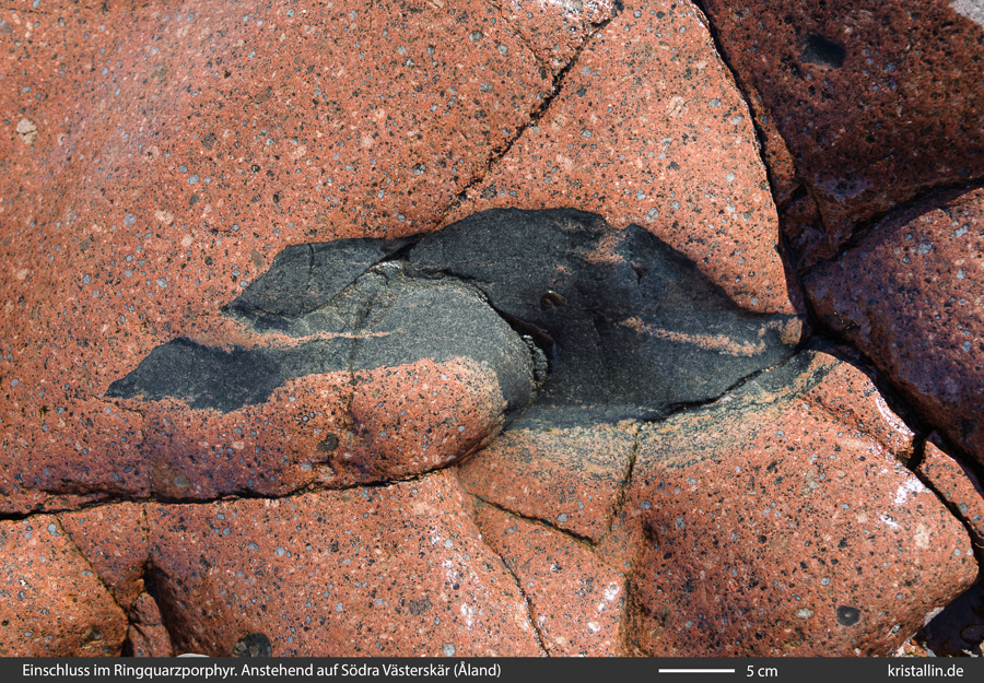 (73/99) Ein großer Xenolith im Ringquarzporphyr. Er zeigt ringsum Auflösungserscheinungen.