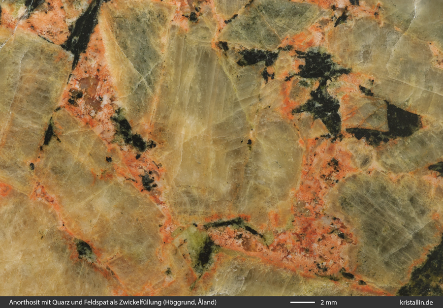 (4/28) Ob die Masse zwischen den Plagioklaskristallen vom benachbarten Rapakiwigranit stammt, ist eine noch offene Frage.