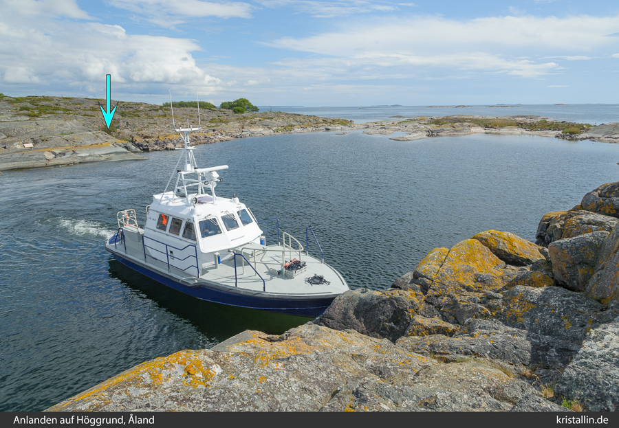 (10/28) Auf unbefestigten Inseln drückt man das Schiff mit der Nase ans Ufer und steigt über den Bug aus. Im Hintergrund zeigt der Pfeil auf den Kontakt zwischen Anorthosit und älterem Grundgebirge.